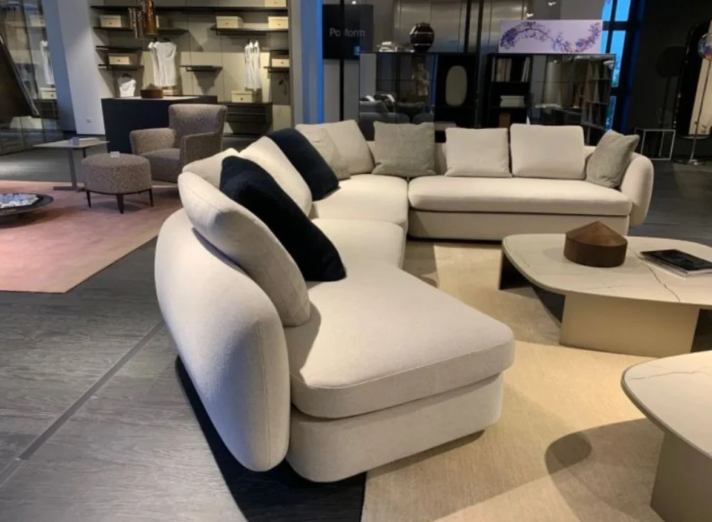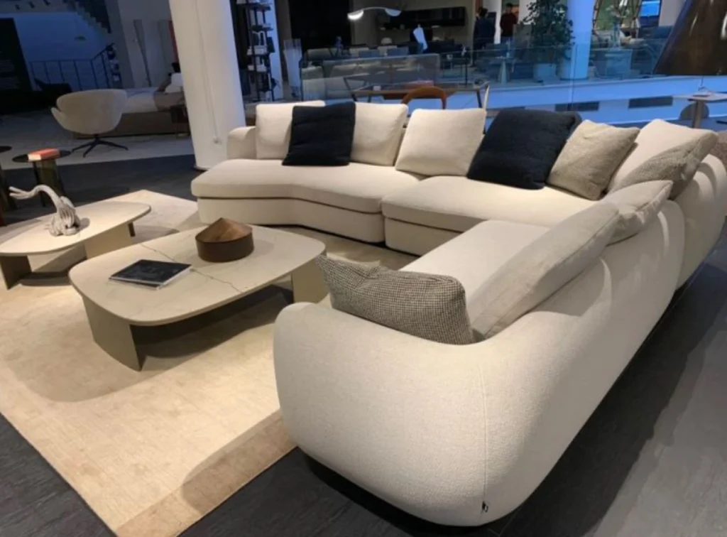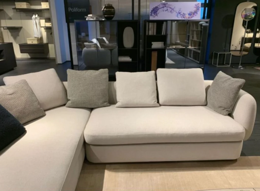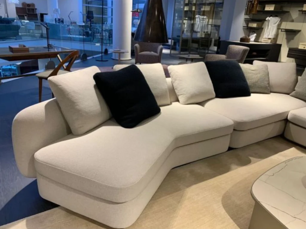 Il divano รจ rivestito in tessuto Agadir colore sabbia, un materiale morbido e resistente che dona eleganza e comfort. La struttura รจ completata con un basamento in black nickel opaco, per un contrasto elegante che arricchisce il design complessivo. - Cuscini: