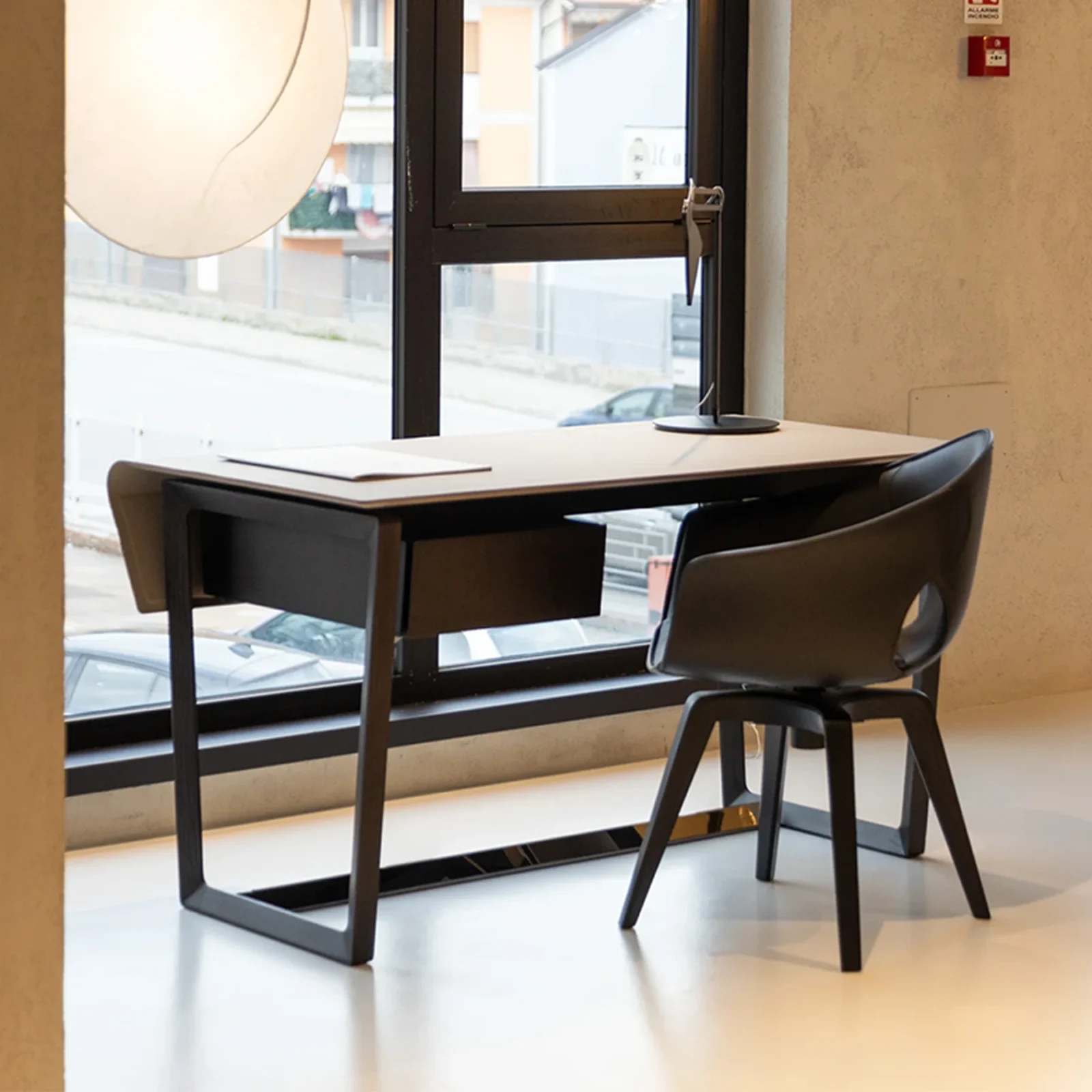 La scrivania Fred, realizzata in frassino wengรฉ con dettagli in cuoio, รจ un capolavoro di leggerezza geometrica e design stiloso.... Leggi di piรน