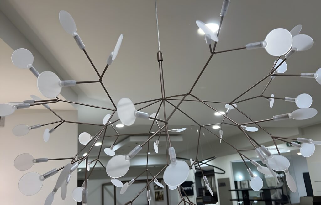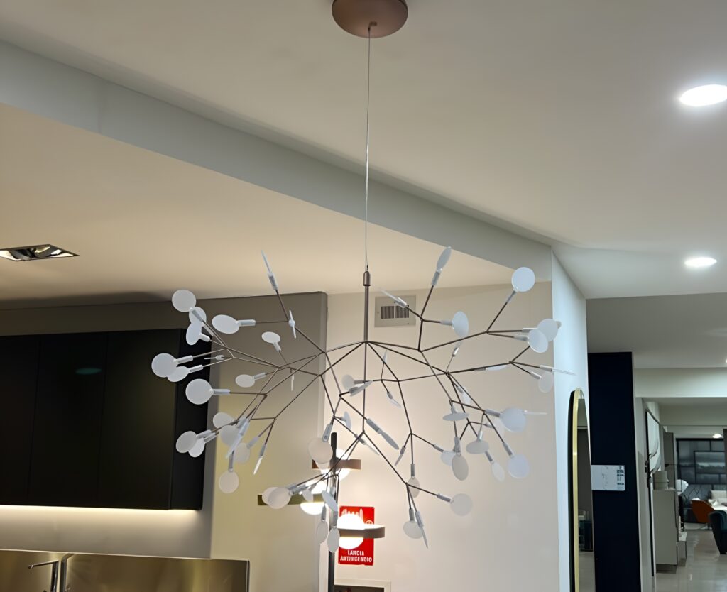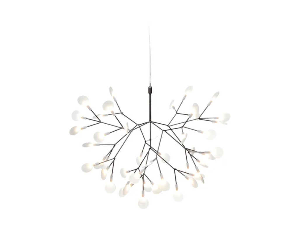 Fiori che sboccianoโ€ฆ Ispirata alla pianta Heracleum, nota per il suo fogliame a forma di ombrello, questa incredibile sospensione evoca un bouquet di fiori sbocciato e arioso. La sospensione Heracleum รจ costituita da rami flessibili in filo metallico alle cui estremitร  sono appese, come foglie, lenti in policarbonato traslucido contenenti le sorgenti LED. Simili a rami, i fili metallici sono assemblati asimmetricamente secondo un'istintiva logica creativa. Questa complessa rete di ramificazioni evoca materia viva iscritta in un processo generativo. Fine, flessibile e malleabile, i fili metallici possono essere modellati a mano per dar loro la forma desiderata. Questa struttura in evoluzione ed equilibrata รจ incredibilmente ariosa. I fili metallici fungono da conduttore (corrente elettrica a bassissima tensione) per alimentare le sorgenti luminose a LED. Questa tecnologia Electrosandwich brevettata da Moooi permette di fare a meno degli antiestetici cavi elettrici e di mantenere un'estetica leggera e raffinata. Per rafforzare l'impressione di luci sospese nel vuoto, il cavo elettrico รจ trasparente. I molteplici fasci di luce sembrano sospesi nello spazio. Questo sciame di luci รจ come una miriade di stelle scintillanti, una farandola di lucciole o il gran finale di uno spettacolo pirotecnico. Fusione di naturale e artificiale, questa sospensione leggera ed evanescente รจ una vera e propria scultura luminosa che porterร  la sua poesia ovunque in casa. Questa sospensione dalle dimensioni eccezionali veste grandi spazi con la sua singolare presenza architettonica.