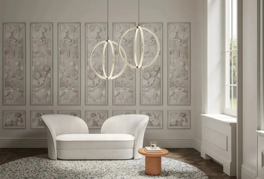 Grazie ai tubi in policarbonato sfaccettato e ai supporti in alluminio verniciato, la luce LED si diffonde uniformemente a 360ยฐ, illuminando lโambiente in modo equilibrato. Questa soluzione progettuale unisce estetica e funzionalitร , trasformando la lampada in un elemento decorativo di grande impatto.