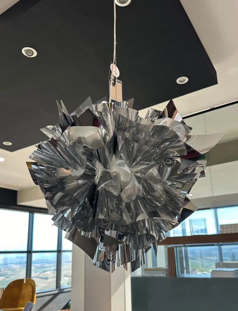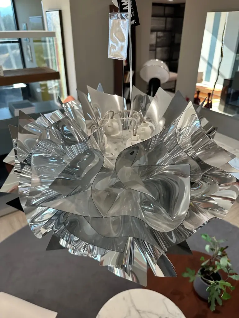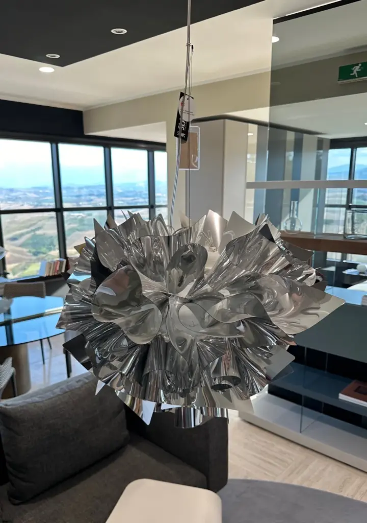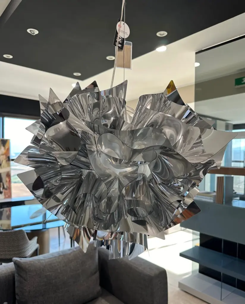 Disegnata da Adriano Rachele per Slamp, รจ una delle assolute novitร aggiunte alla collezione Veli. Questa serie di lampade da sospensione si distingue per le sue brillanti sfaccettature e l'offerta prevede la colorazione Silver.