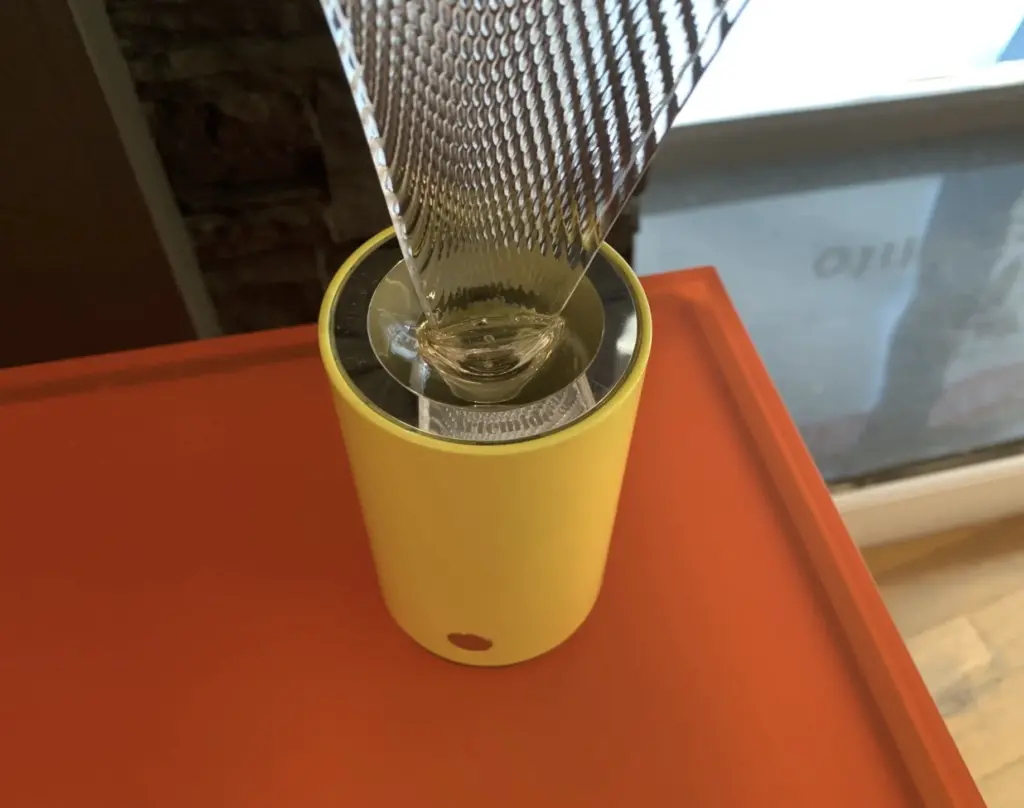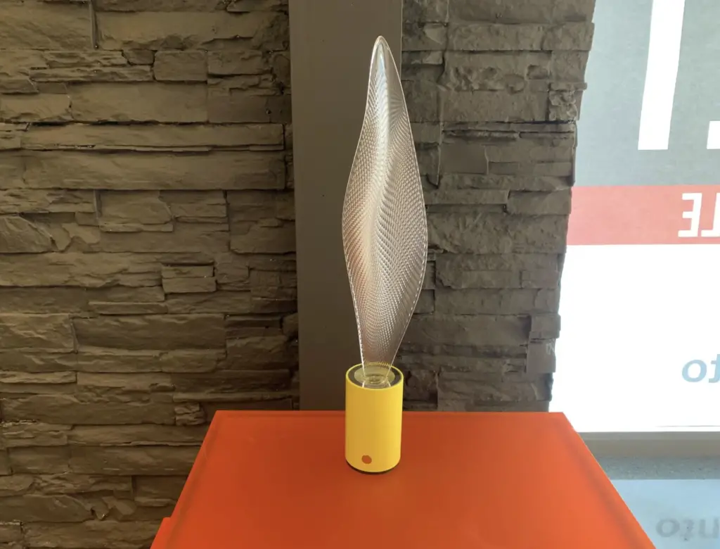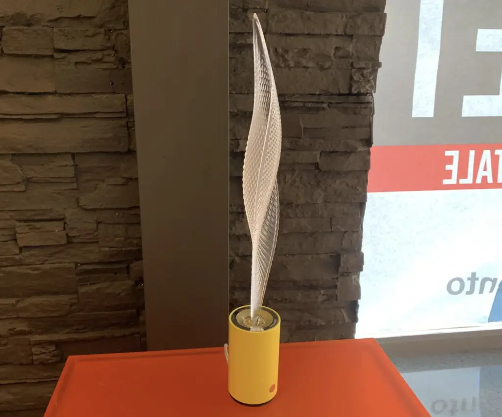 La struttura in metacrilato trasparente conferisce un aspetto etereo e leggero, mentre la base in metallo verniciato giallo aggiunge un tocco di modernitร  e stabilitร . La luce a LED assicura un'illuminazione efficiente e duratura, ideale per chi cerca un pezzo d'arredo che unisca estetica e praticitร .