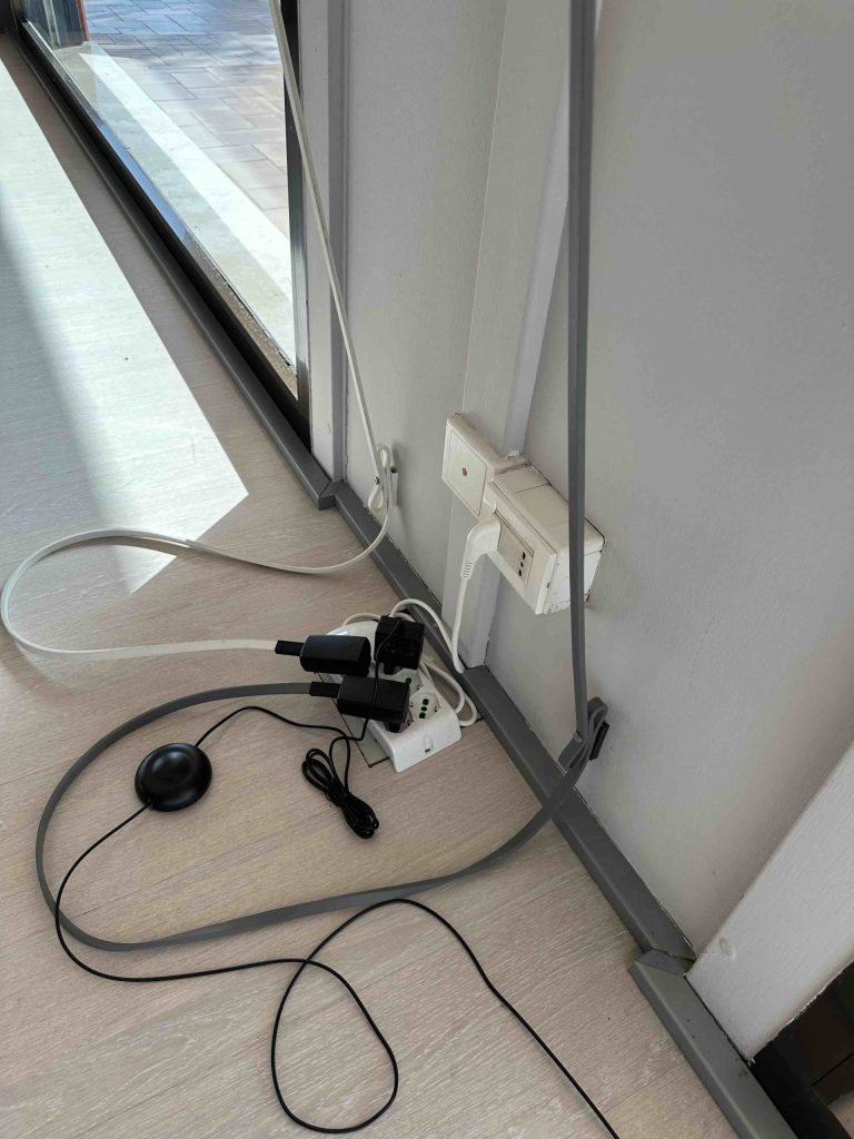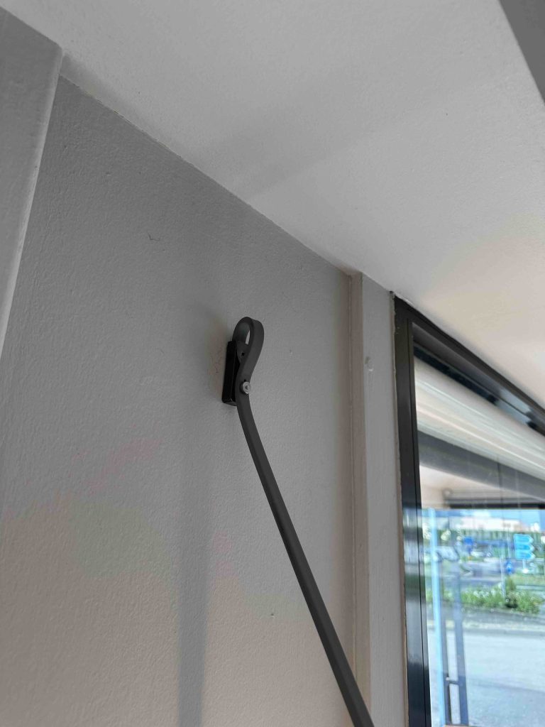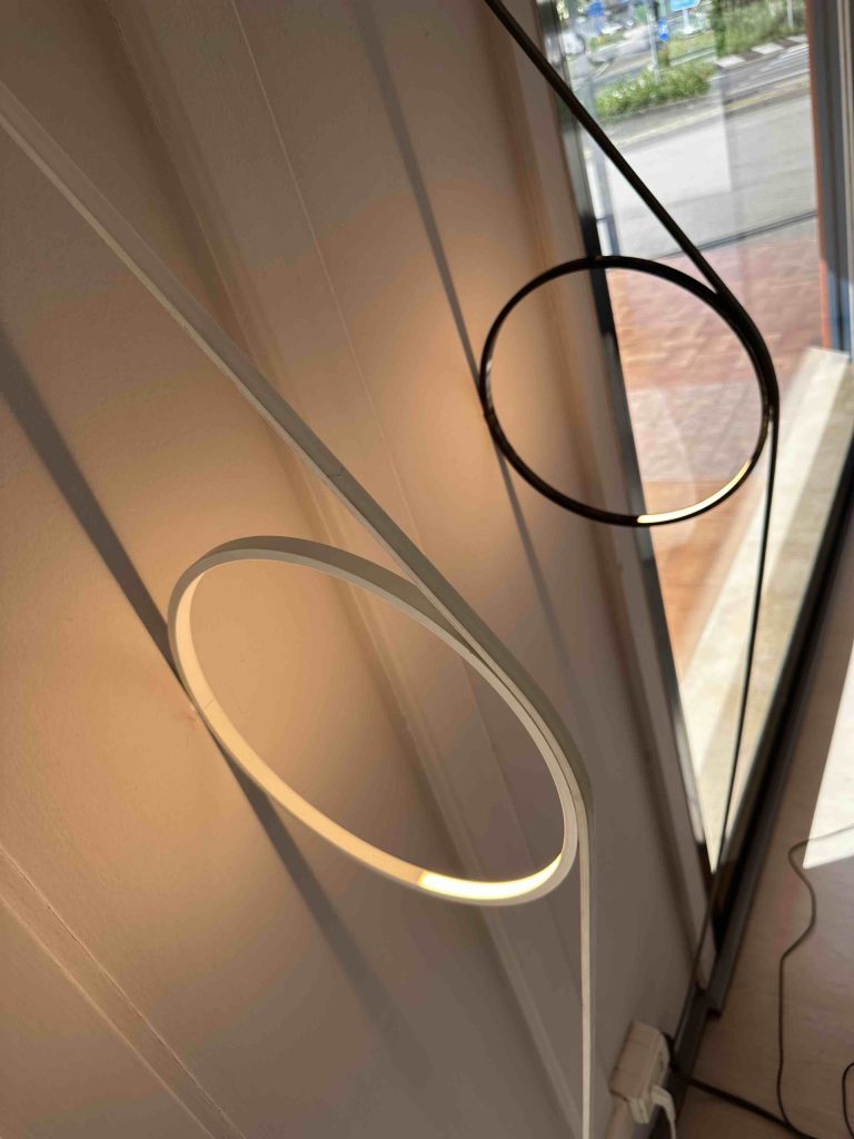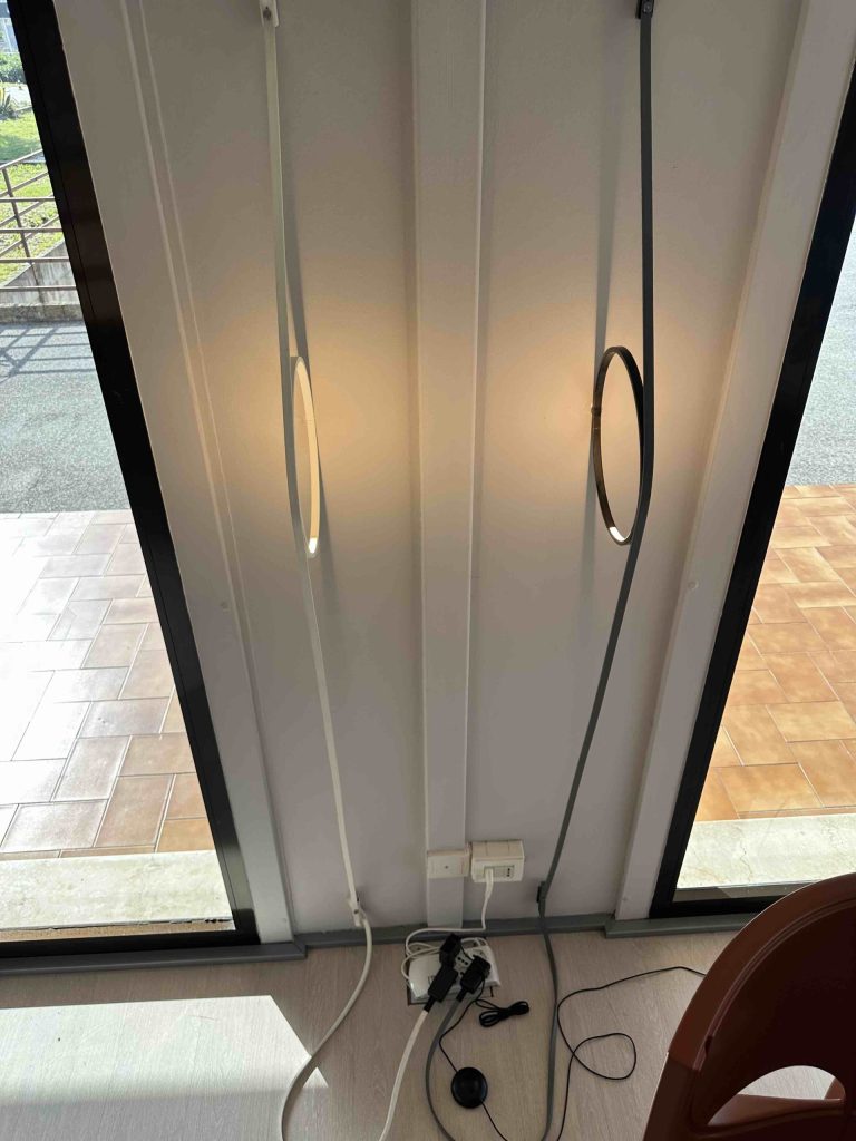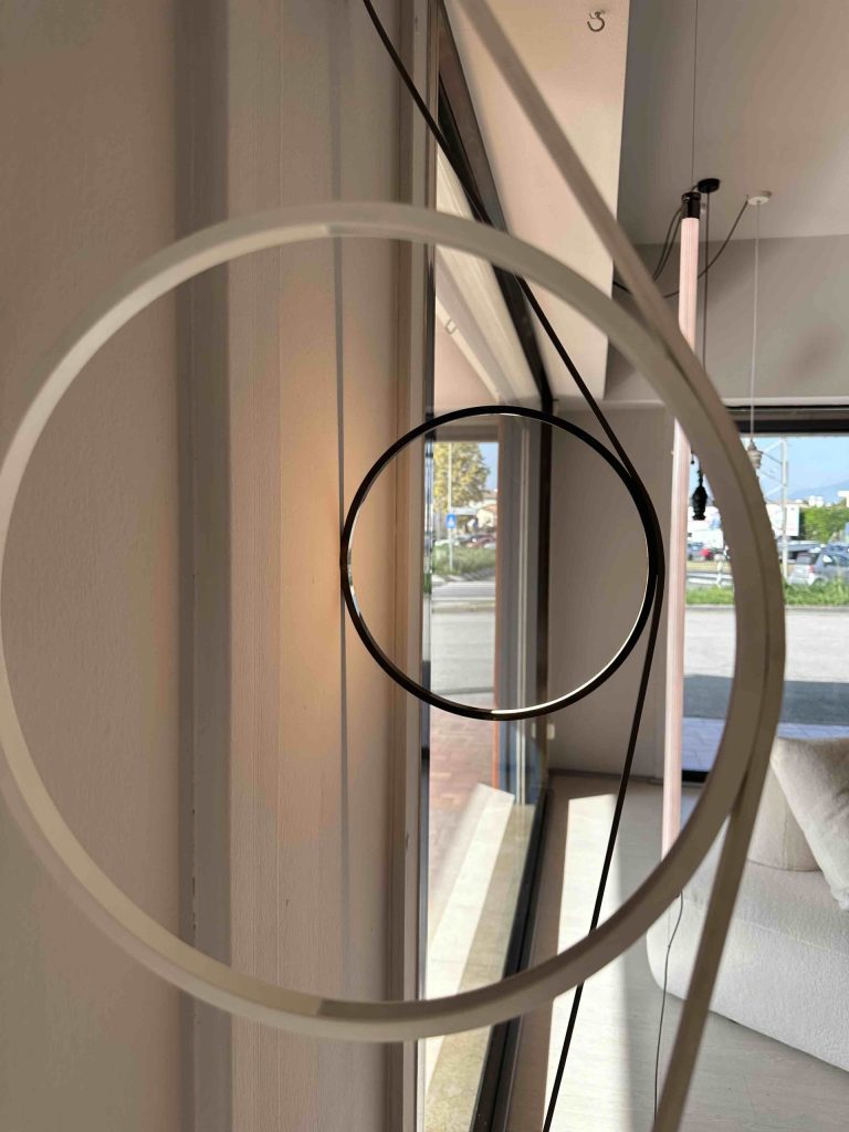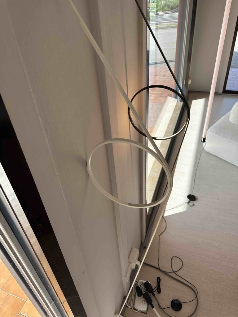 • Cavo speciale in gomma colorata: Funziona sia come elemento di alimentazione che come dettaglio decorativo, fissato a parete con giunti in ABS in coordinato con lโ€™anello.