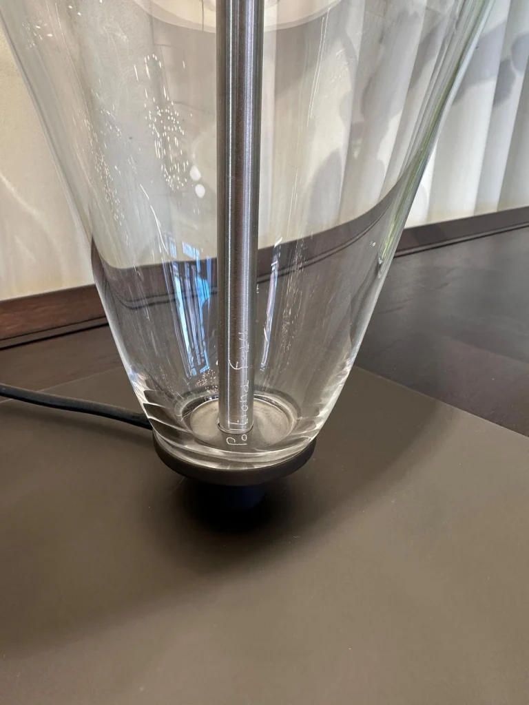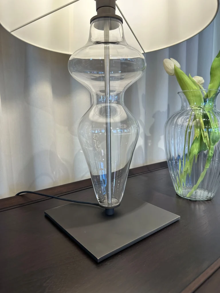 Disponibile in versione da tavolo, รจ un pezzo di design sofisticato che aggiunge un tocco di eleganza a qualsiasi ambiente. La base in vetro trasparente ha linee slanciate e morbide, modellate per evocare la silhouette stilizzata di una figura femminile. Per maggiore stabilitร , la base dโappoggio รจ realizzata in metallo verniciato, con raccordi in ottone brunito che collegano perfettamente la struttura. Il paralume, composto da un doppio strato di tela e PVC, garantisce una diffusione uniforme della luce, mentre nella versione da terra รจ arricchito da un doppio paralume, per un effetto visivo ancora piรน ricercato.