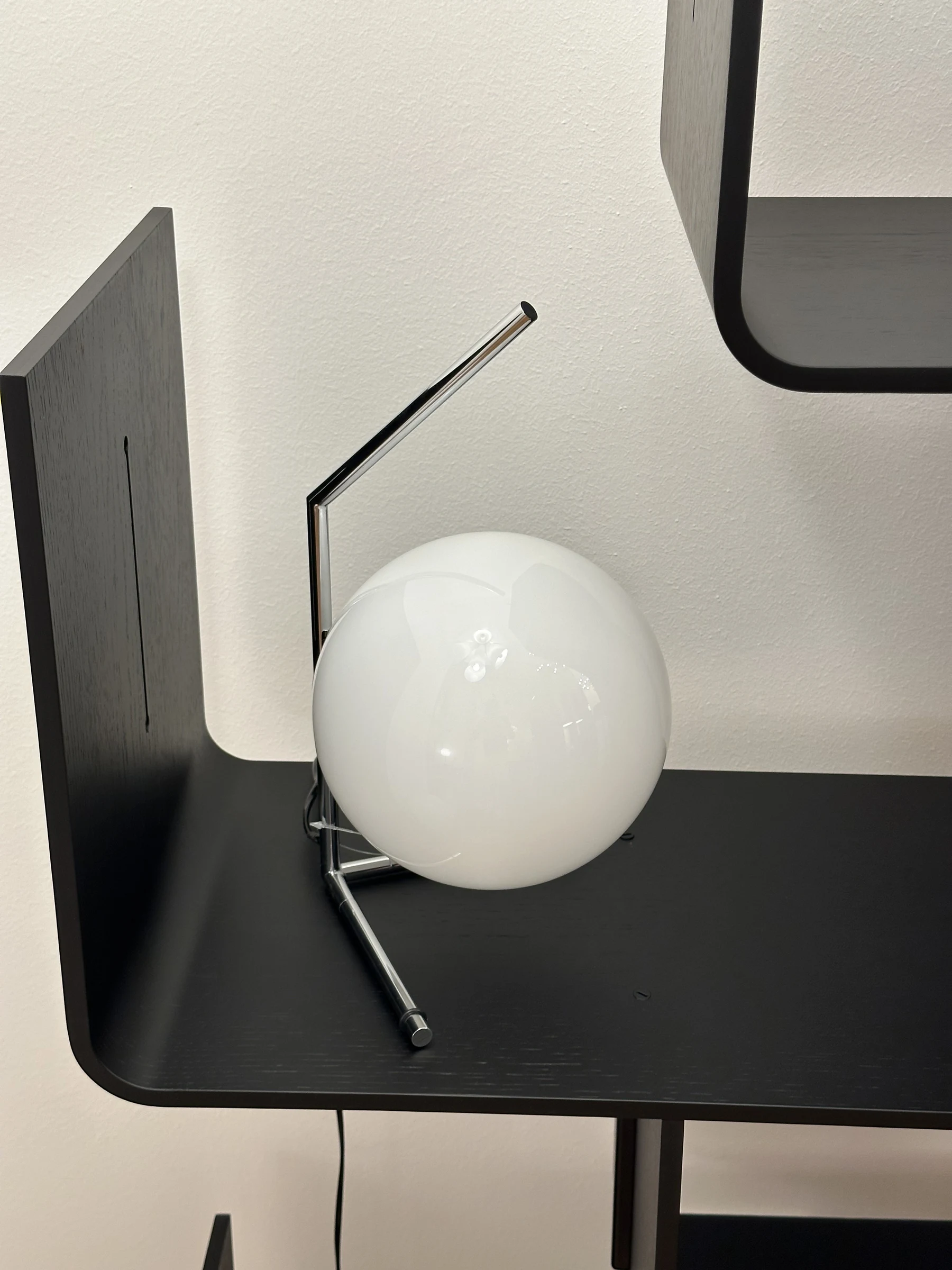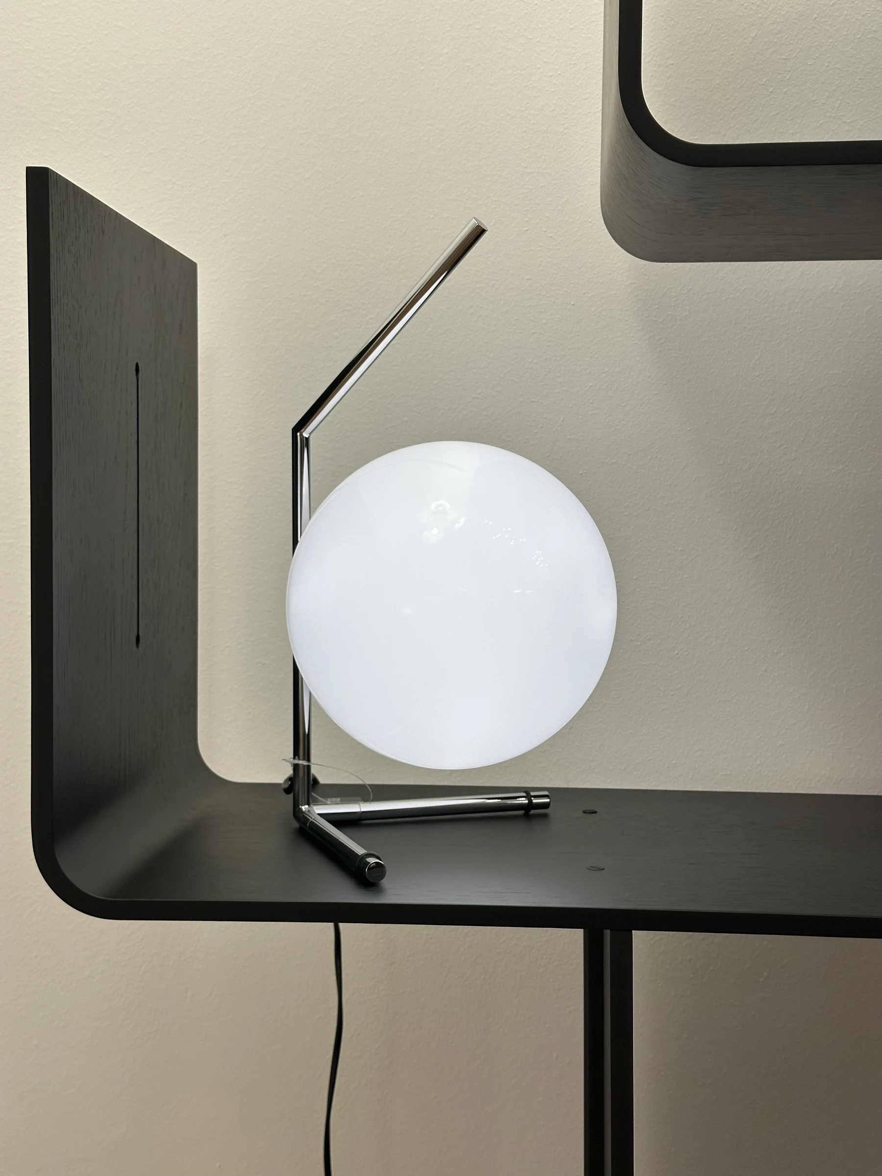 • Materiali: La IC T1 รจ realizzata con una struttura in acciaio e ottone, e il diffusore in vetro soffiato opalino diffonde una luce morbida e delicata, creando un'atmosfera accogliente.