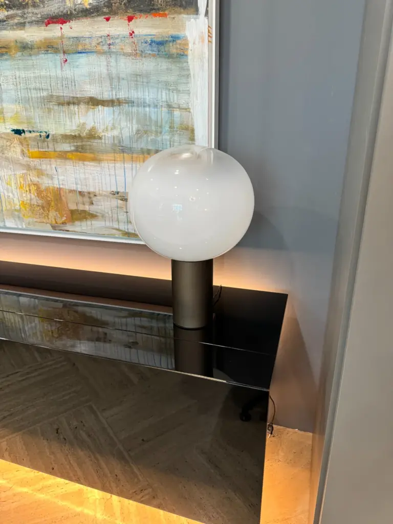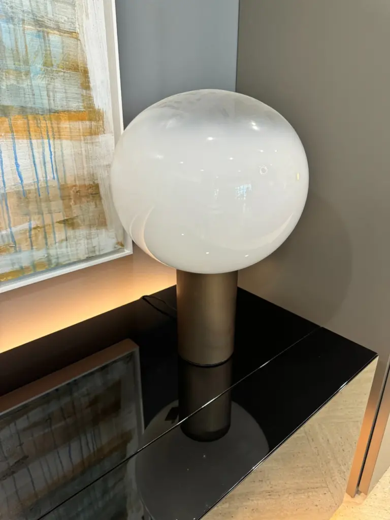 Il cuore della lampada รจ realizzato in vetro soffiato opale, un materiale pregiato che diffonde la luce in modo uniforme. La parte superiore del vetro diventa trasparente, consentendo alla luce di dirigersi verso l'alto come un faretto, creando un effetto luminoso suggestivo. La base della lampada รจ un cilindro in metallo, che offre stabilitร e un contrasto elegante con la delicatezza del vetro. Questa combinazione di materiali rende la Laguna 37 non solo un pezzo funzionale, ma anche un'opera d'arte moderna. Il vetro presenta sfumature cristalline che aggiungono un effetto brillante alla luce, esaltando la bellezza del design e creando un'atmosfera ricca di riflessi sofisticati. La parte opale del vetro diffonde la luce in tutte le direzioni, offrendo un'illuminazione omnidirezionale che avvolge lo spazio circostante in un'atmosfera rilassante e accogliente.