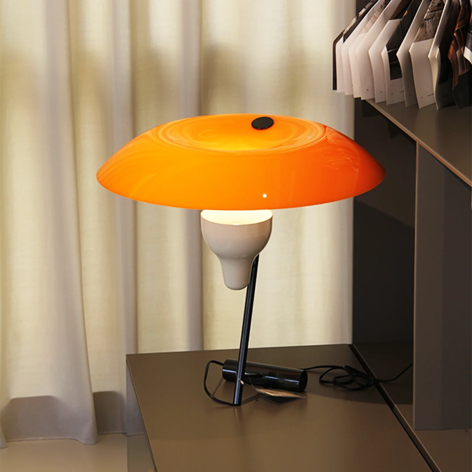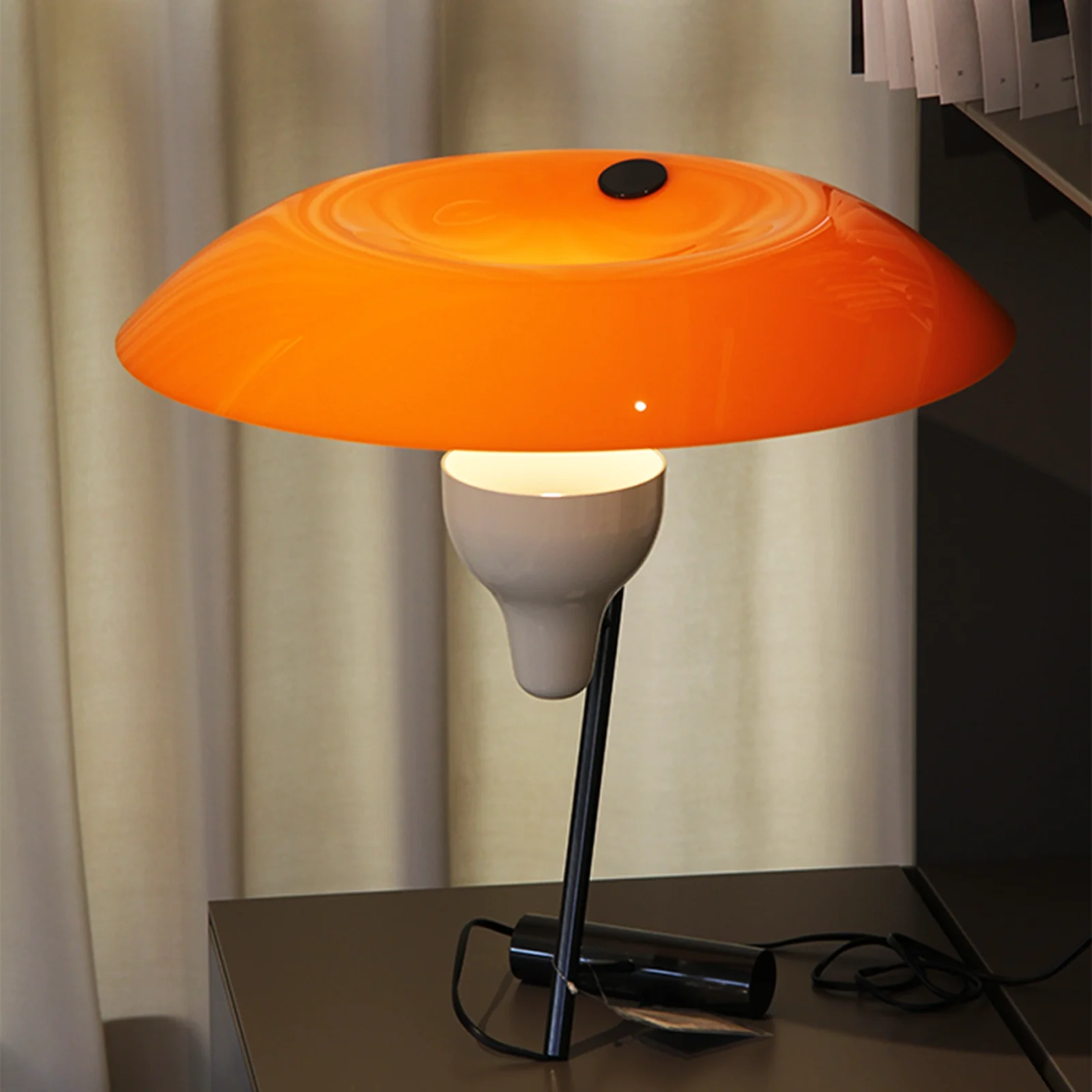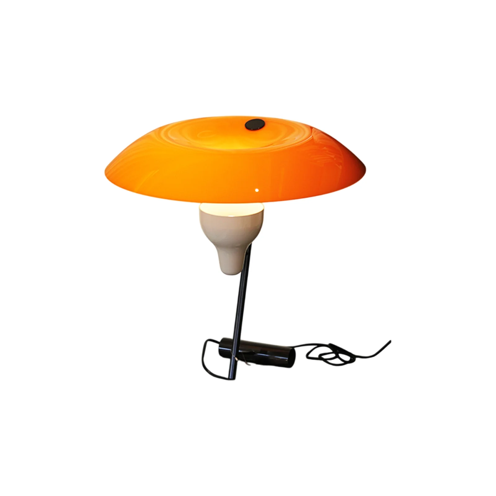 Il grande diffusore in metacrilatoย arancione, contribuisce a un effetto luminoso altamente elegante, diventando un elemento essenziale nellโillusione ottica e nel gioco di percezioni che caratterizza questa lampada. Il proiettore in alluminio bianco verniciato รจ montato su un gambo tubolare in ottone lucido o brunito, mentre una piccola barra in ottone funge da contrappeso, stabilizzando la lampada.