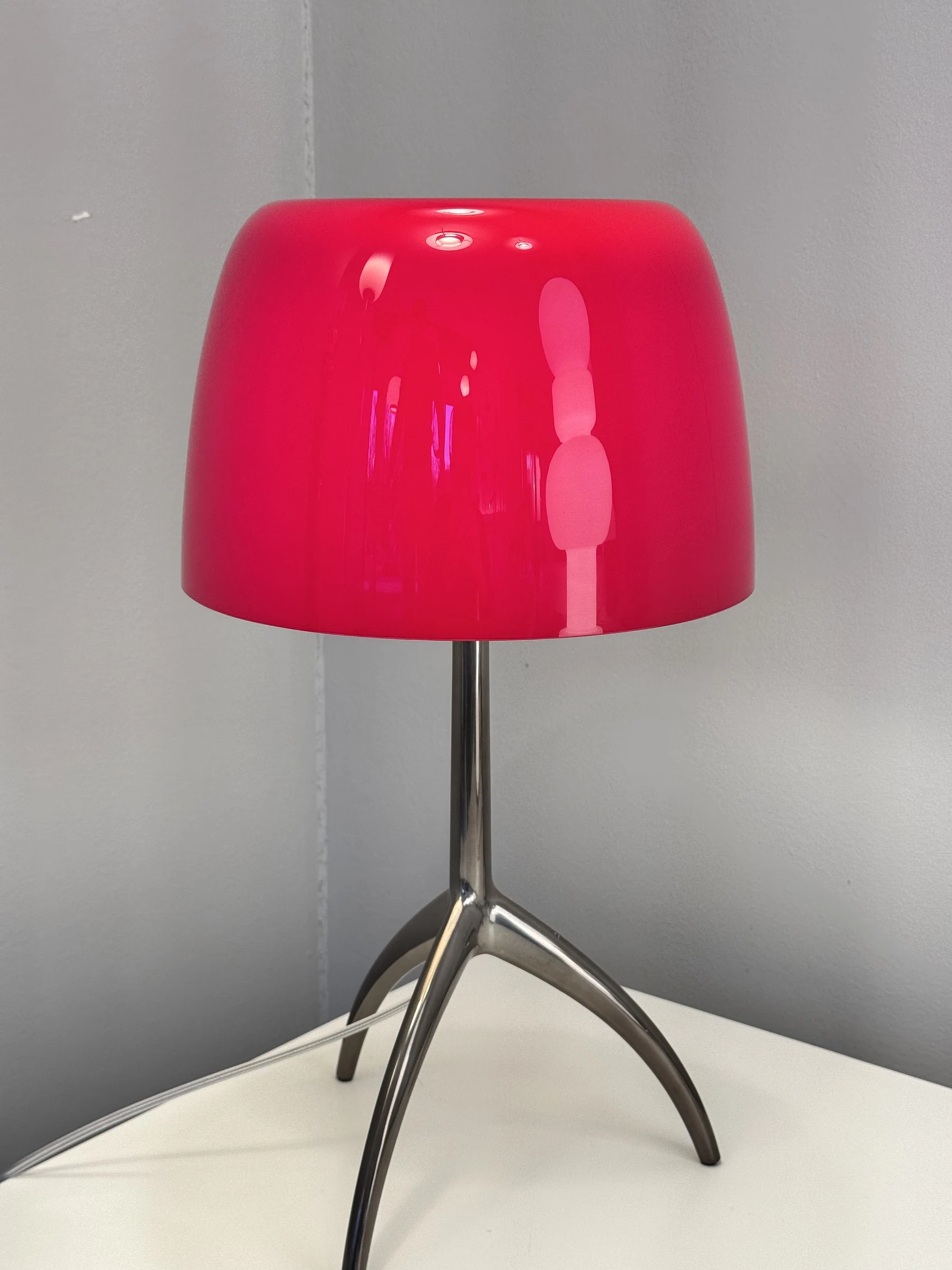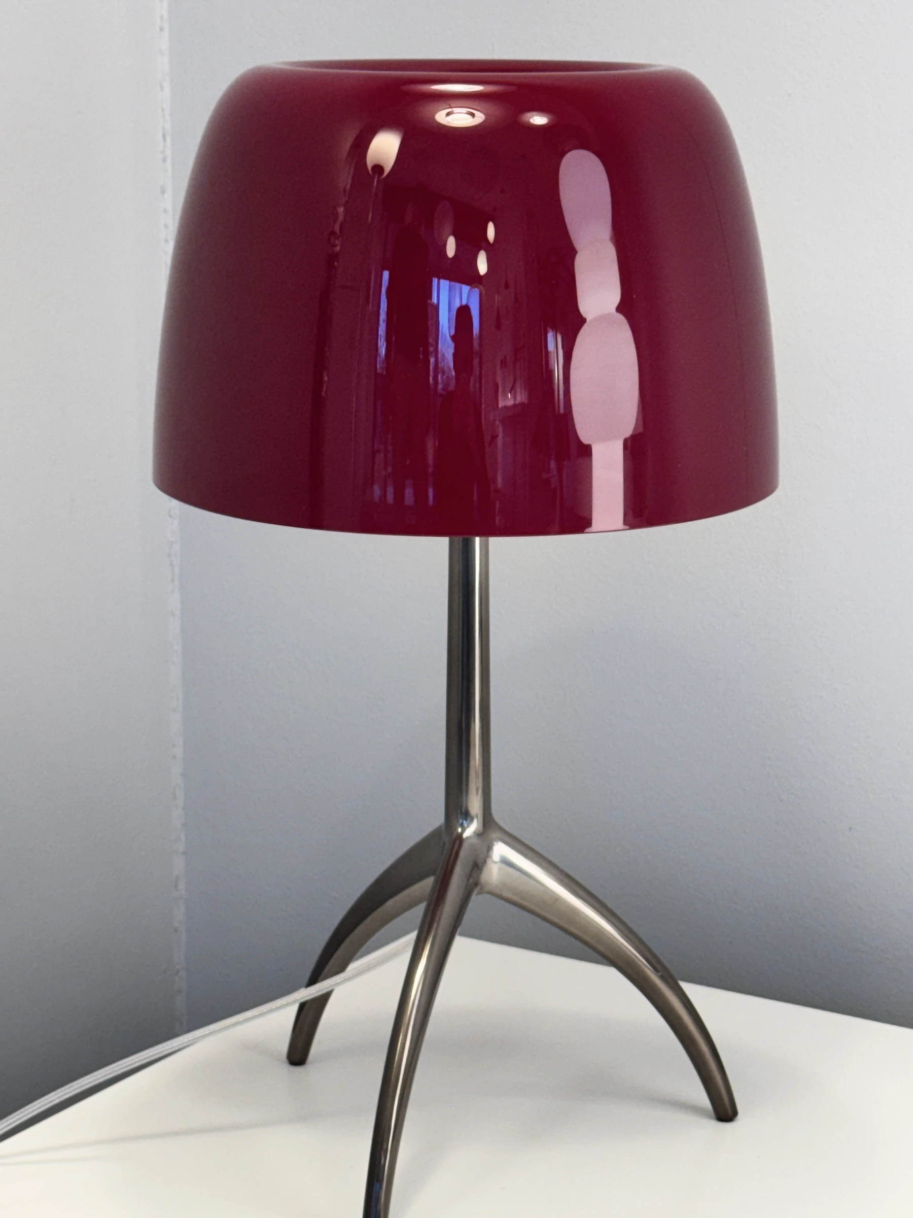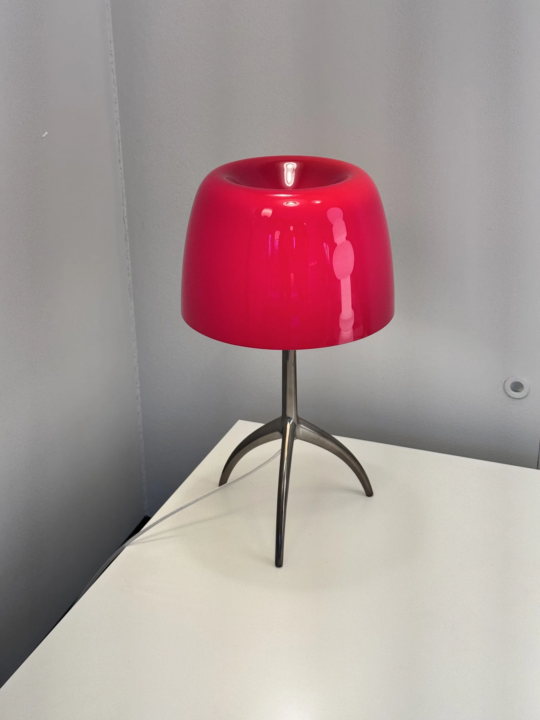 - Design: La Lumiere รจ dotata di un diffusore in vetro soffiato incamiciato verniciato color Ciliegia. La base a treppiede, realizzata in alluminio spazzolato verniciato, aggiunge un tocco di modernitร , rendendo la lampada adatta per ambienti raffinati come soggiorni, camere da letto o uffici.