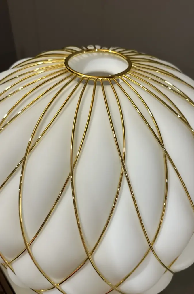 La lampada Pinecone รจ realizzata con un diffusore in vetro soffiato, prodotto utilizzando l'antica tecnica del vetro soffiato ingabbiato. Durante la creazione, il maestro vetraio soffia a bocca la bolla di vetro all'interno di una gabbia metallica, che contiene e modella la naturale espansione del vetro. Questo processo artigianale crea un gioco di tensione visiva unico, rendendo ogni pezzo una vera e propria opera d'arte. La gabbia metallica della lampada รจ impreziosita da un trattamento galvanico, disponibile in una raffinata finitura dorata che la rende lucida e brillante. Il contrasto tra il vetro trasparente e la struttura metallica dorata crea un oggetto elegante e sofisticato, quasi sospeso nell'atto di fuoriuscire dal proprio vincolo.