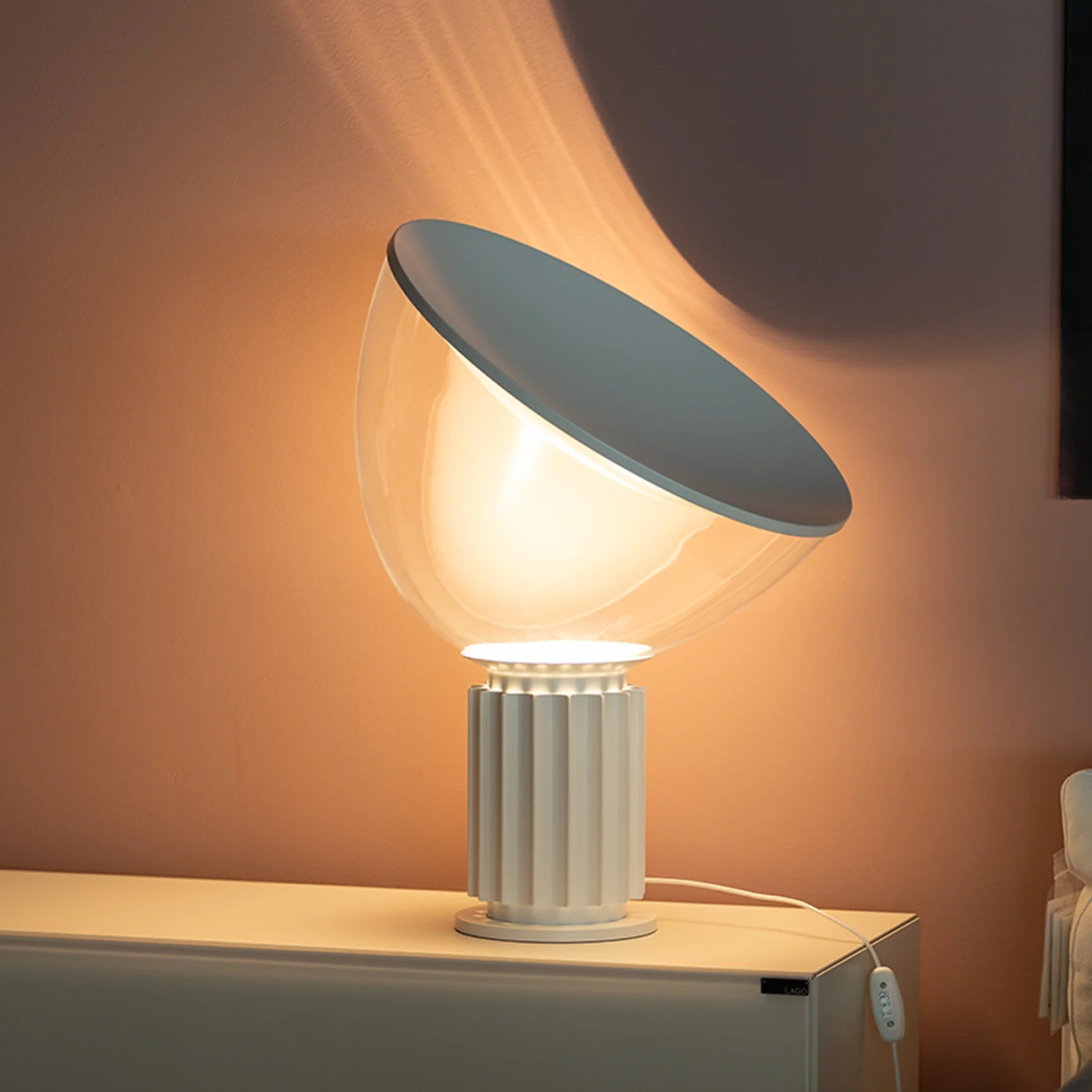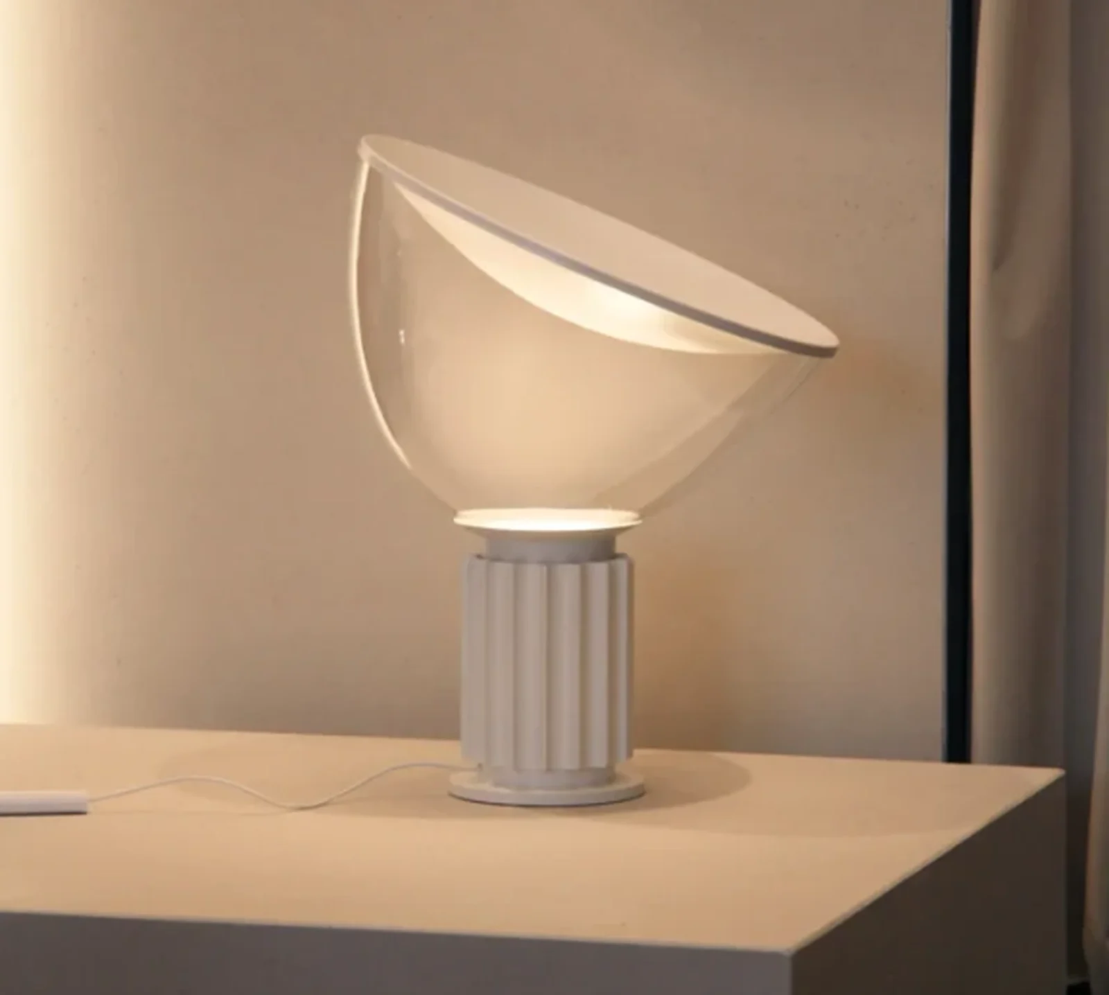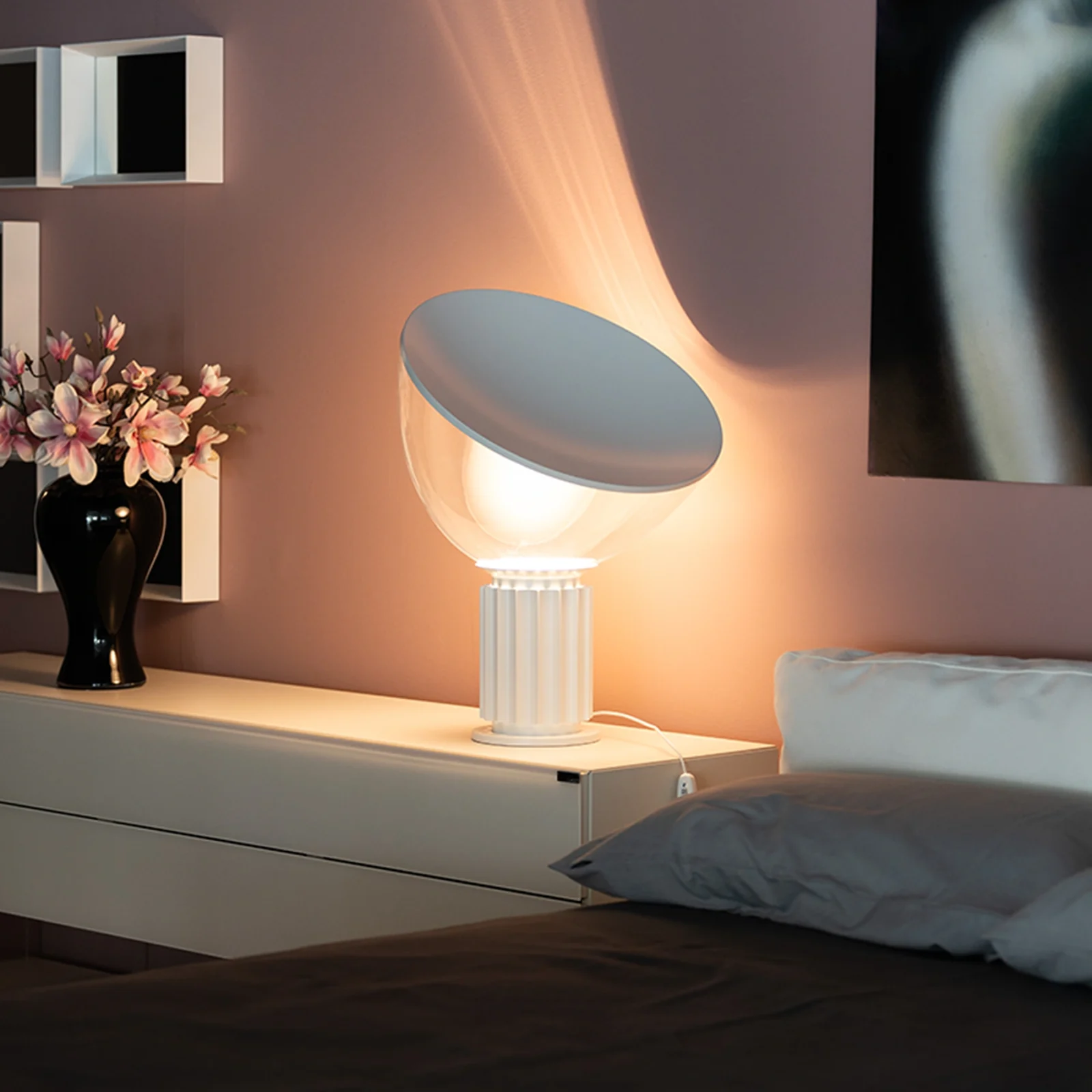 - Riflettore: Il riflettore della lampada Taccia รจ realizzato in metallo verniciato. Il contrasto tra il bianco lucido interno e il bianco a polvere esterno permette una diffusione uniforme e delicata della luce, creando unโilluminazione morbida che non abbaglia.