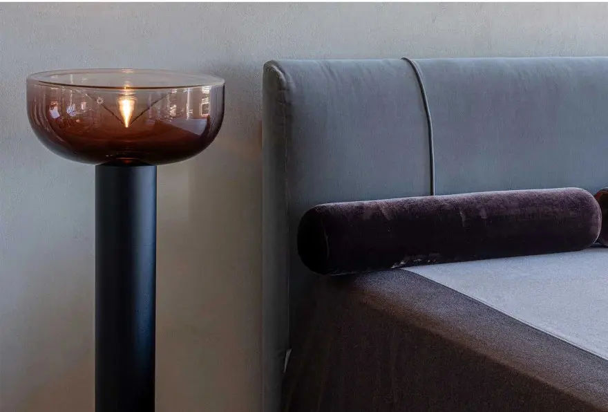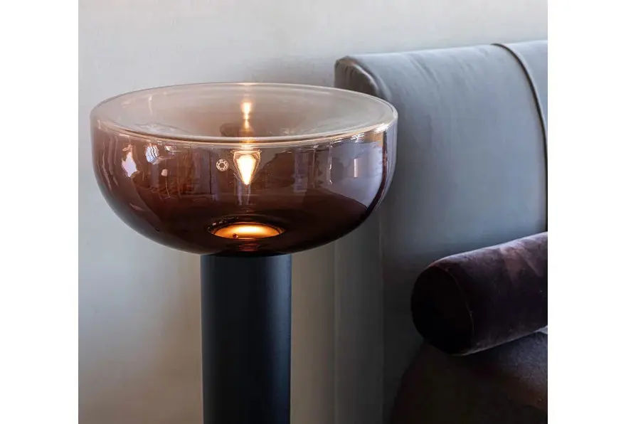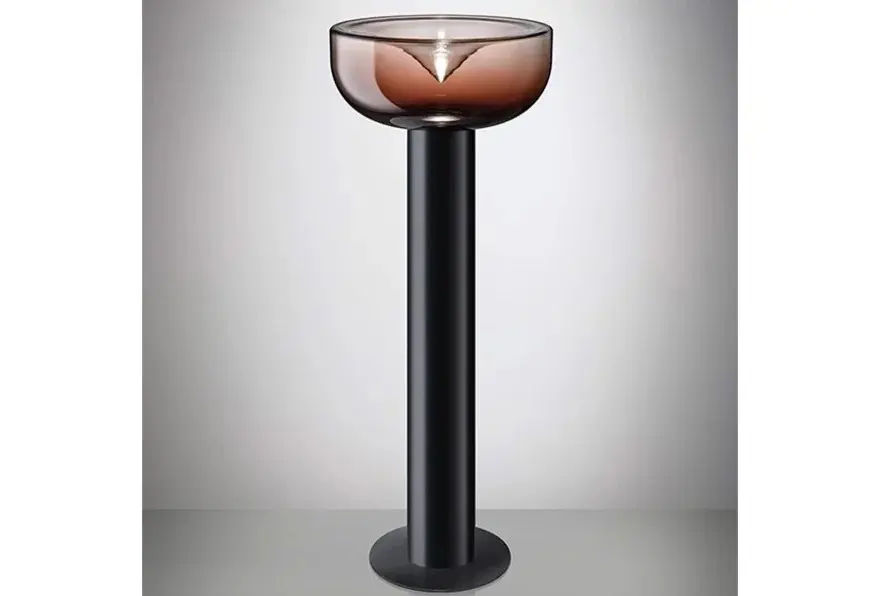 Rispetto al modello da tavolo, questa versione presenta una struttura slanciata in alluminio estruso con finitura nero opaco, studiata per garantire maggiore stabilitร e un forte impatto visivo. Il diffusore in vetro soffiato da ร45 cm crea una luce morbida e avvolgente, valorizzando le superfici e lโatmosfera dellโambiente.