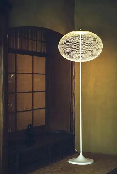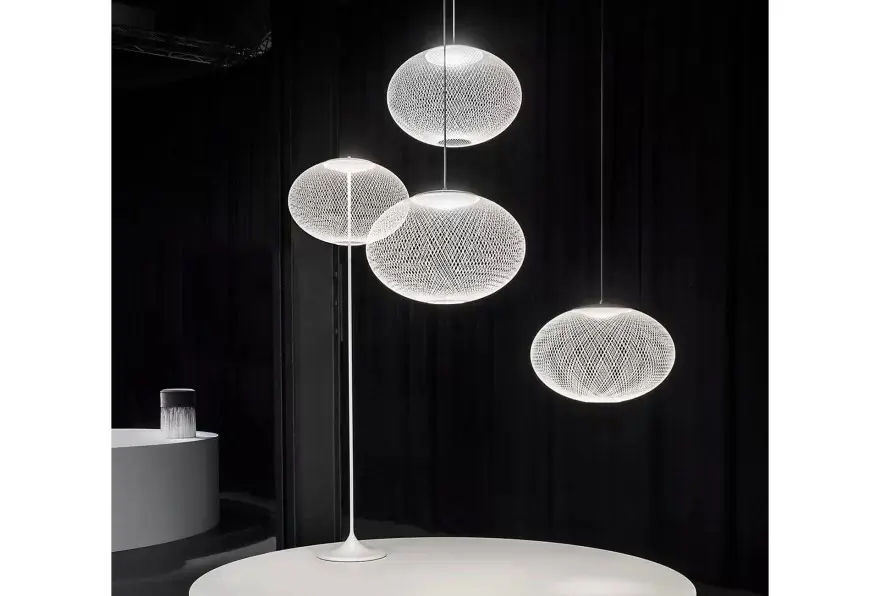 Il paralume ha una caratteristica forma ellissoidale ed รจ realizzato in fiberglass e resina epossidica. La particolare struttura a rete conferisce alla lampada un aspetto etereo e armonioso, lasciando filtrare la luce in modo delicato e diffuso. Inoltre, il diffusore interno in materiale plastico ammorbidisce ulteriormente lโemissione luminosa, creando unโatmosfera accogliente e rilassante.