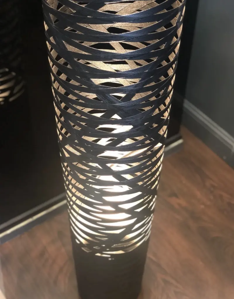 La lampada da terra Tress LED di Foscarini รจ un capolavoro di design innovativo, realizzata con un nastro di fibra di vetro e resina intrecciato in modo unico. Questo materiale conferisce alla lampada una struttura solida e un aspetto decorativo distintivo. Il cavo trasparente, dotato di dimmer, permette di regolare l'intensitร delle luci a LED, offrendo una luce superiore e inferiore regolabile a seconda delle esigenze.