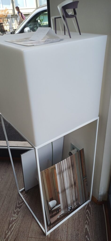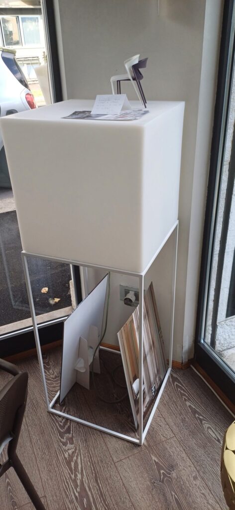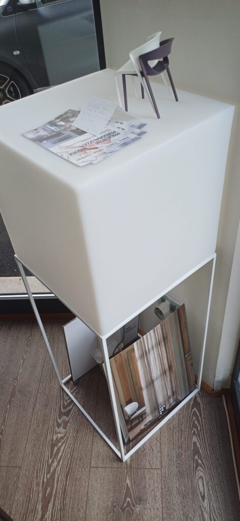 - Basamento in metallo bianco, stabile e dal design elegante.