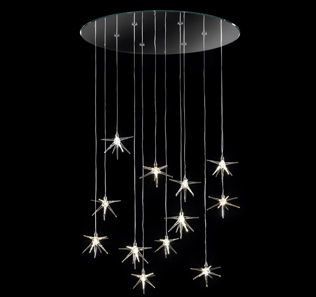Nella collezione di lampade a sospensione di Reflex Angelo, spicca il lampadario Stella: una cascata di stelle di vetro. Questa lampada a sospensione รจ dotata di un supporto in vetro verniciato bianco o nero a specchio, con stelle pendenti in vetro borosilicato soffiato trasparente oppure colorato nelle finiture blu, alessandrite, ambra, giallo, verde, rubino, bianco, nero o ambra iridium, con LED interno. Il lampadario Stella รจ proposto in varie forme e dimensioni, con quantitร  differenti di pendenti ed รจ possibile realizzare versioni personalizzate per dimensioni, lunghezza e forma.