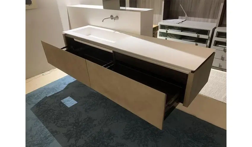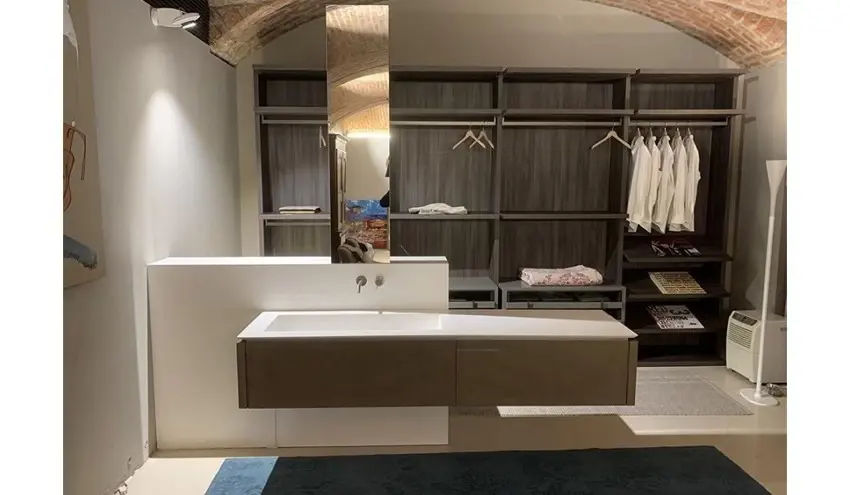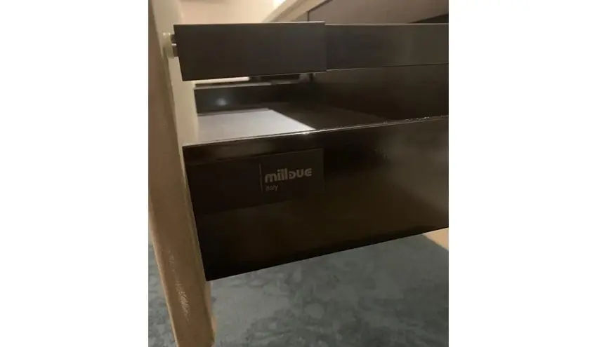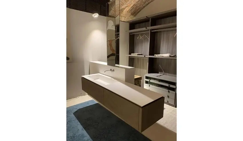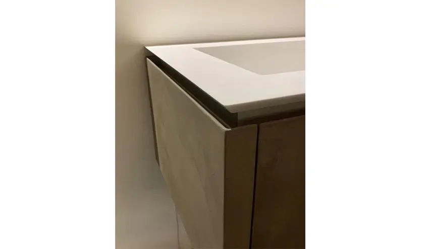 La parte inferiore e i cassetti sono realizzati in finitura argilla color arena, una tonalitร calda e naturale che dona armonia allโinsieme. Il piano Milltek integra il lavabo in modo fluido e funzionale, completato da rubinetteria in acciaio inox spazzolato, scelta per garantire resistenza, durata e unโestetica moderna.
