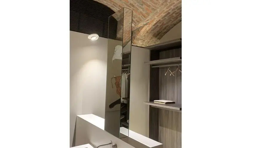 Il mobile contenitore offre una soluzione ampia e ben organizzata, ideale per bagni di design che privilegiano ordine e pulizia visiva. ร possibile completare la composizione con uno specchio coordinato in finitura laccata bianco opaco (non incluso), per un ambiente bagno coerente ed elegante.