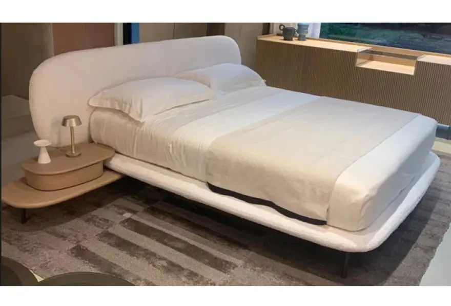 Il rivestimento in tessuto Made F color Bianco valorizza la pulizia delle linee e illumina lโambiente notte. Allo stesso tempo, i comodini integrati, dotati di mensola e cassetto, sono realizzati in Fashion wood rovere canapa, creando un elegante contrasto materico. Infine, i piedi in metallo moka shine aggiungono una nota sofisticata e contemporanea.