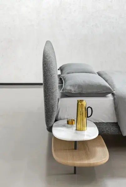 Lโimbottitura leggera e ben calibrata garantisce una sensazione di accoglienza senza appesantire la struttura. Inoltre, il progetto รจ pensato per integrare in modo naturale accessori funzionali, come mensole laterali e pratici cassetti con apertura rotativa. In questo modo, il letto Neyo unisce estetica e praticitร .