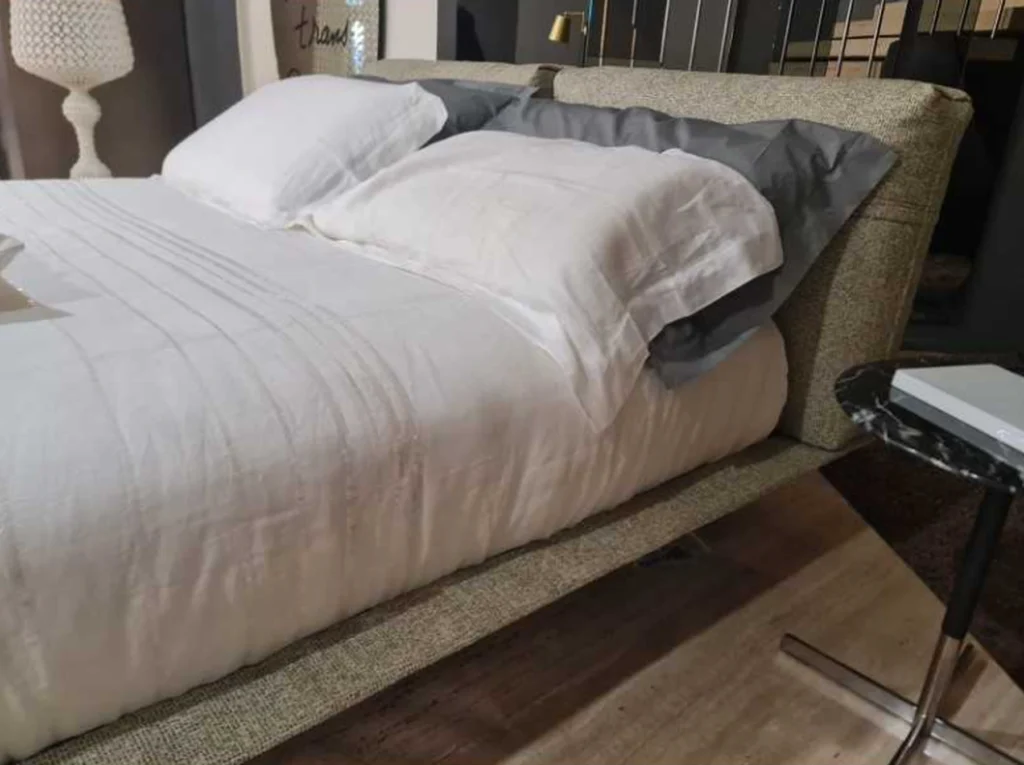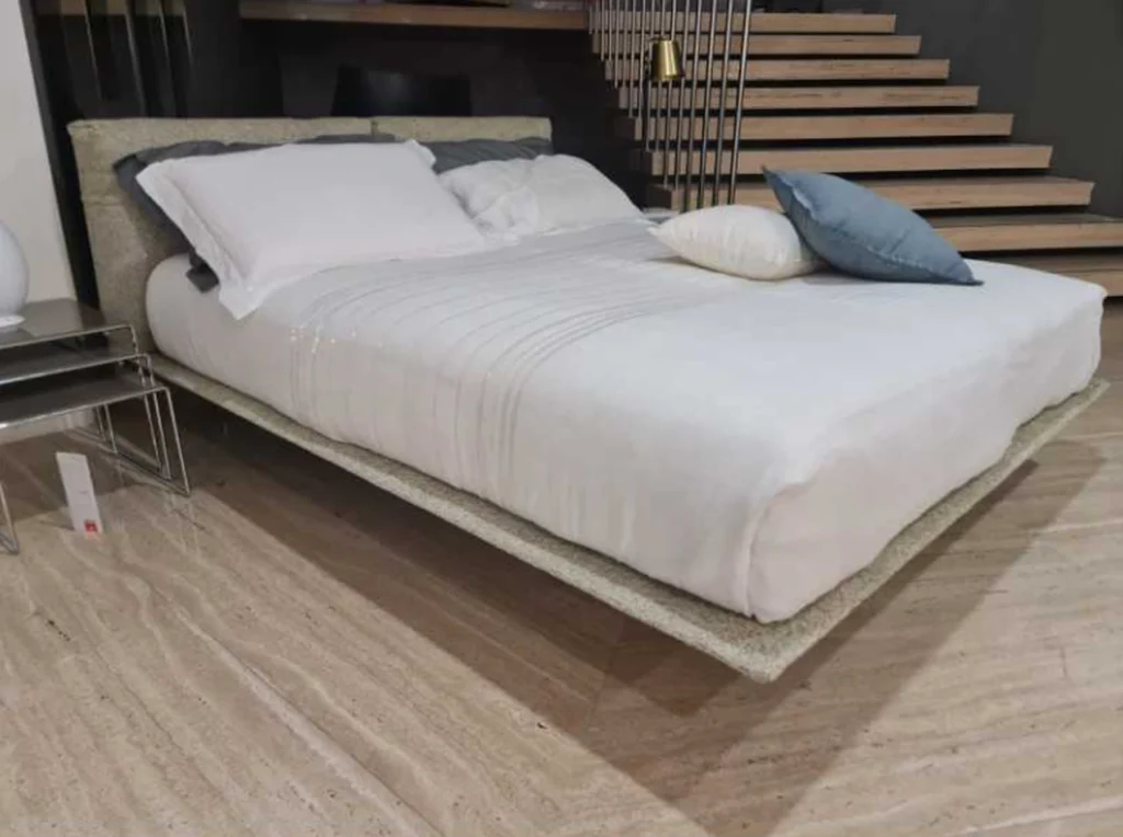 • La forte presenza volumetrica del materasso รจ contrastata da un pianale sottile e minimalista, che crea un effetto sospeso, lasciando il letto fluttuare nel suo spazio.