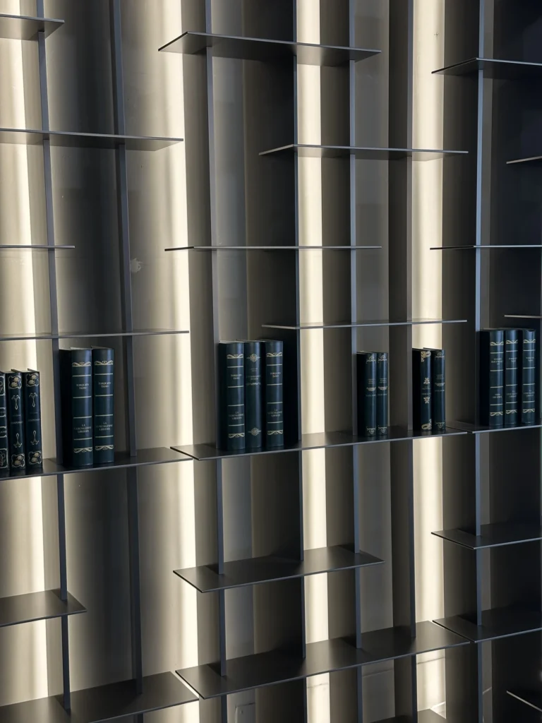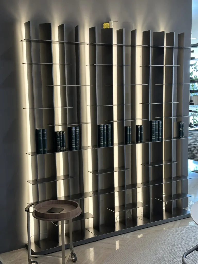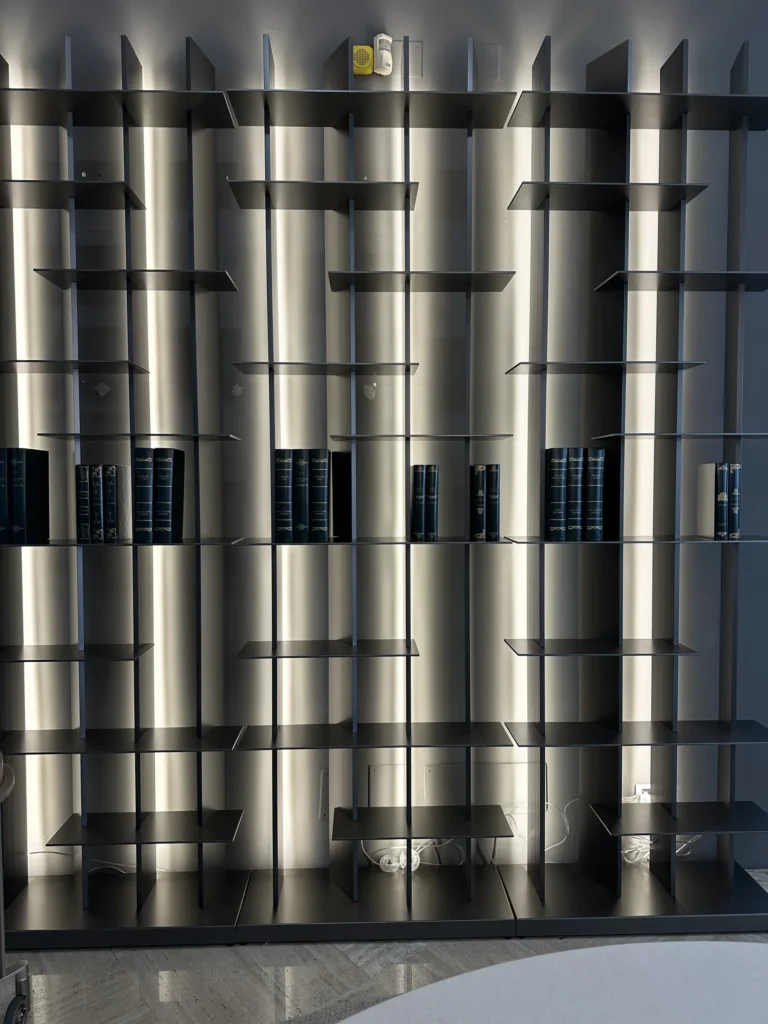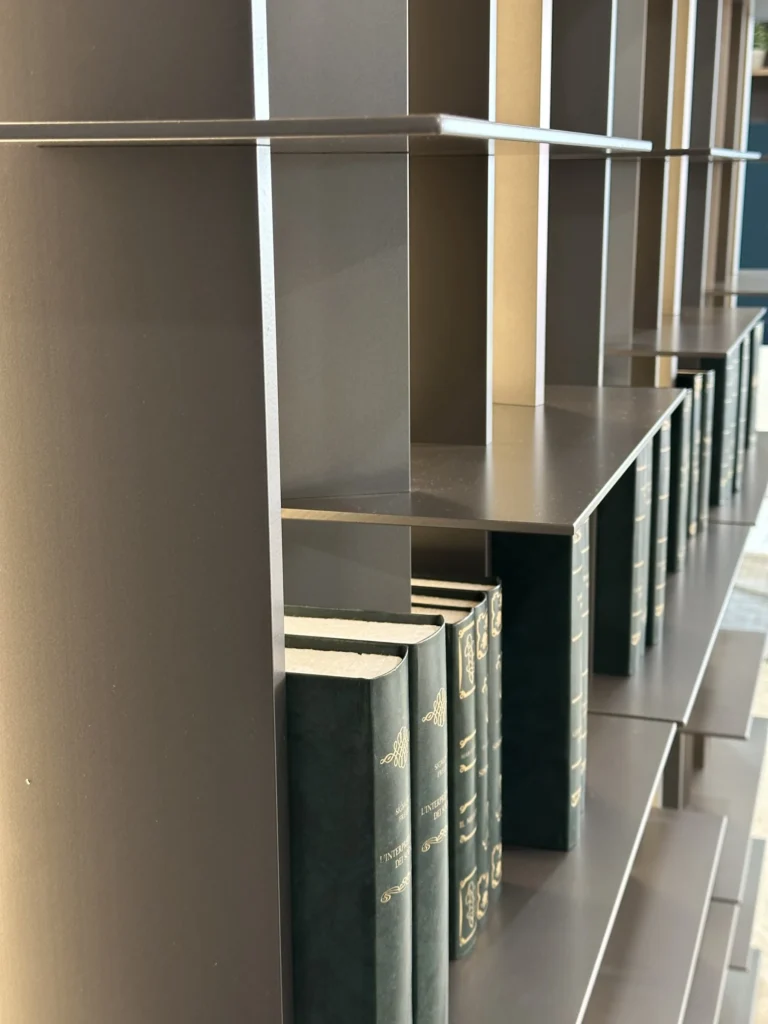Realizzata in alluminio, la struttura si presenta snella e moderna, con unโeleganza contemporanea che non sacrifica la funzionalitร : offre infatti ampi spazi per l'organizzazione di libri e oggetti.