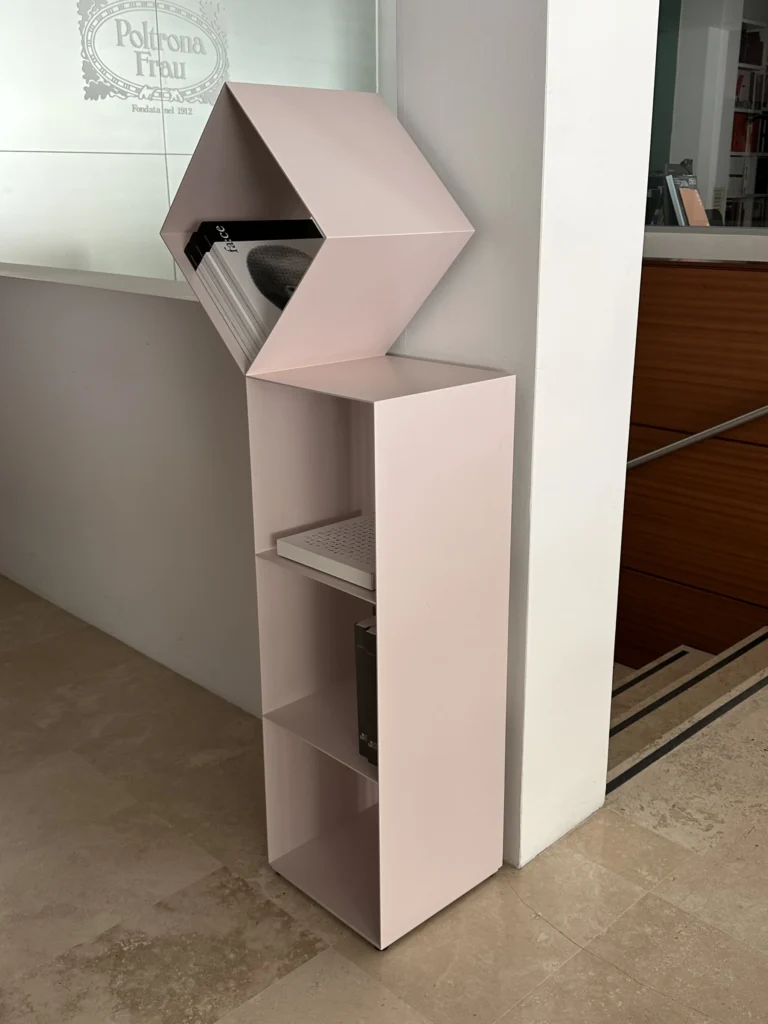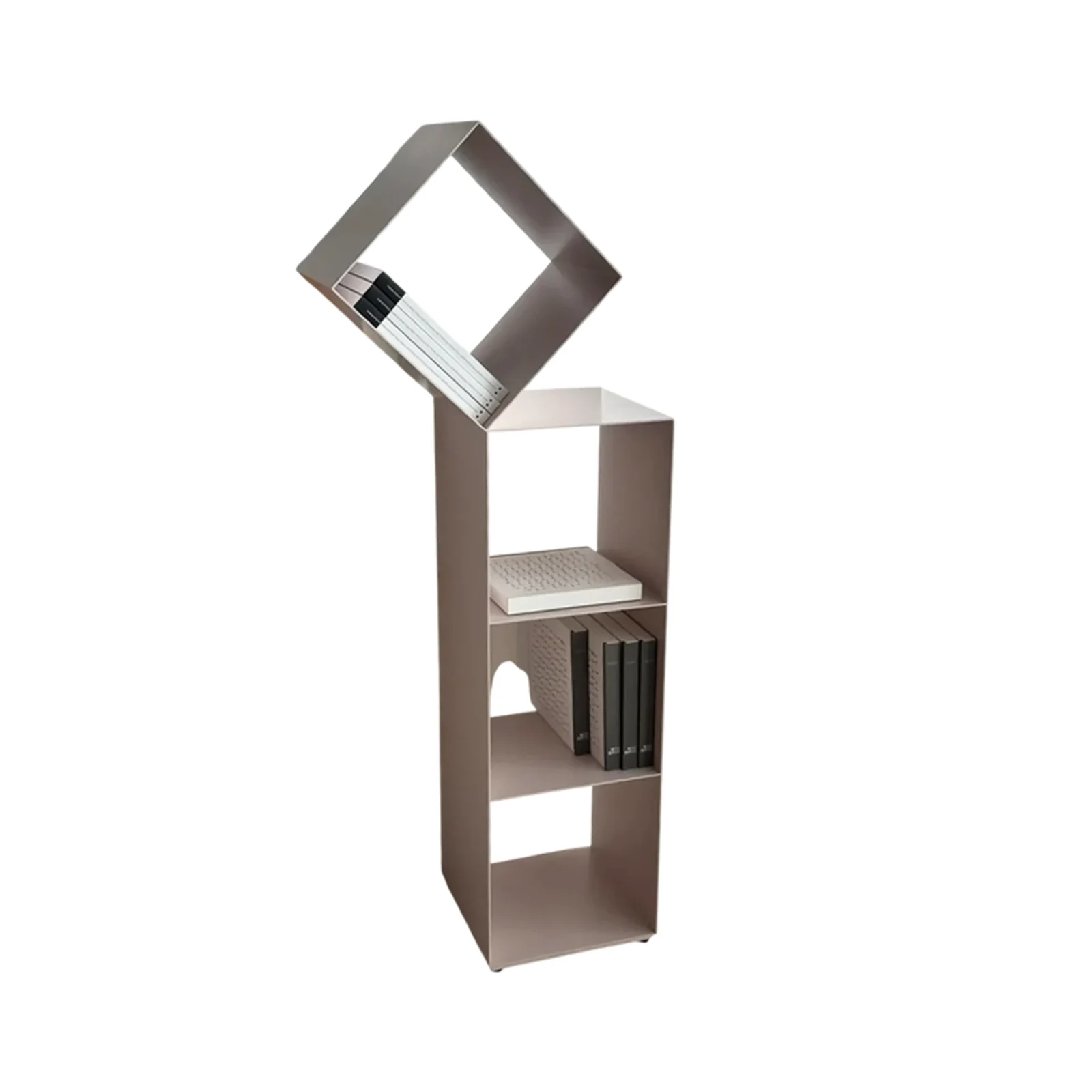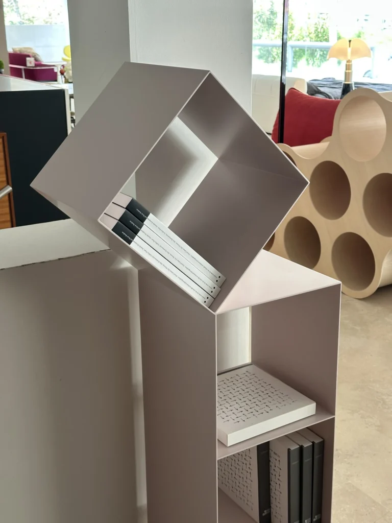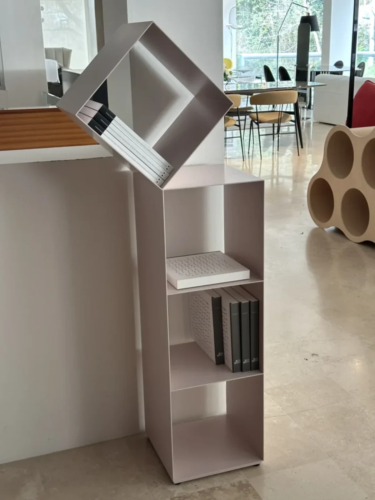 La libreria si presenta come una colonna slanciata e lineare, composta da una sequenza di cubi regolari che formano i ripiani. Il dettaglio distintivo รจ rappresentato dallโultimo cubo, inclinato in modo da creare un effetto visivo di movimento, come se volesse separarsi dagli altri, conferendo alla struttura un senso di dinamismo.