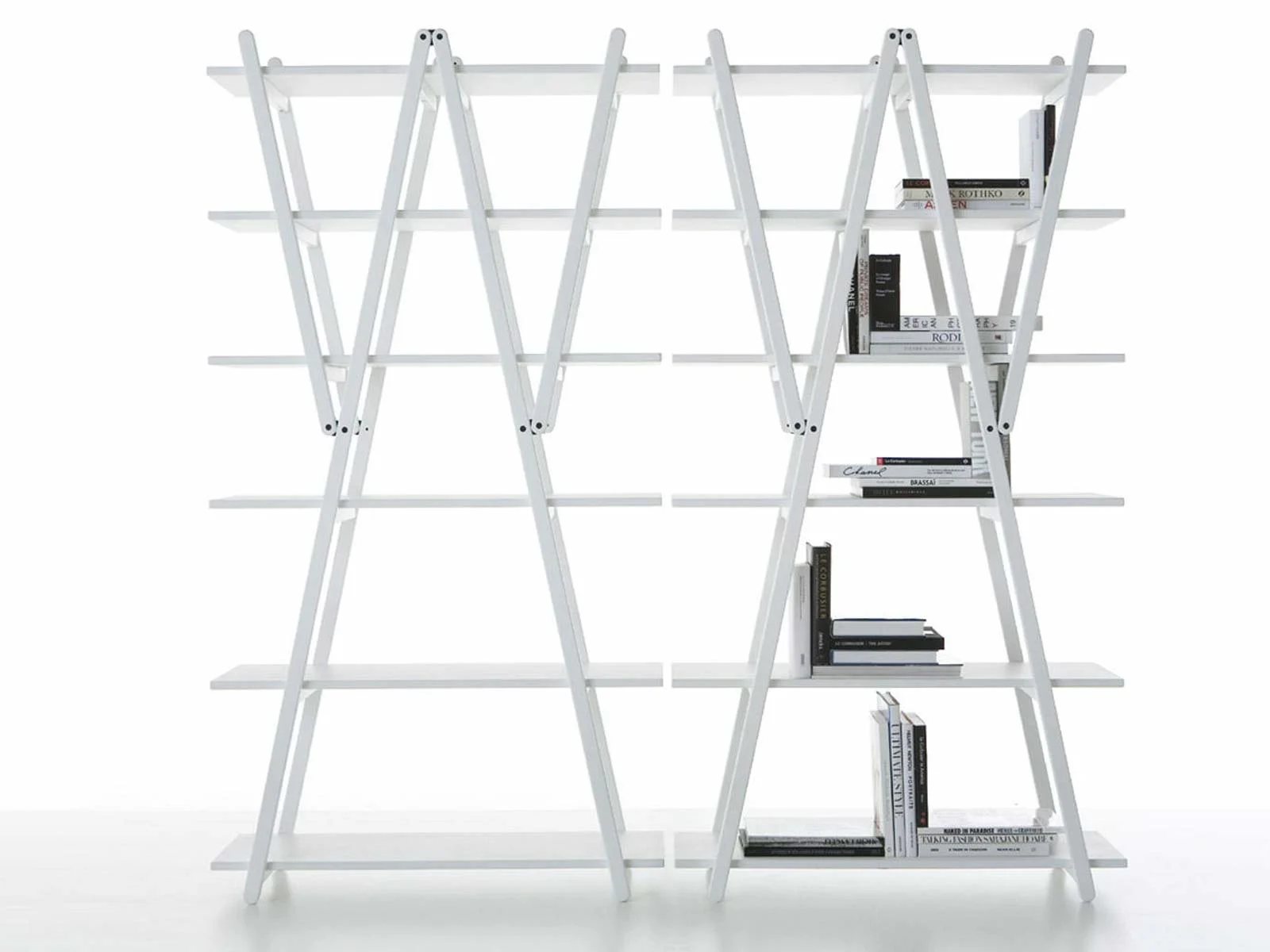 Realizzata in legno massello con raffinata finitura laccata bianca, la Libreria Nuvola Rossa si distingue per la sua struttura pieghevole, una soluzione intelligente che consente di utilizzarla non solo come libreria, ma anche come divisorio leggero per organizzare gli spazi in modo dinamico. Il gioco geometrico degli elementi incrociati crea un ritmo visivo armonioso, capace di arredare con personalitร senza appesantire lโambiente.