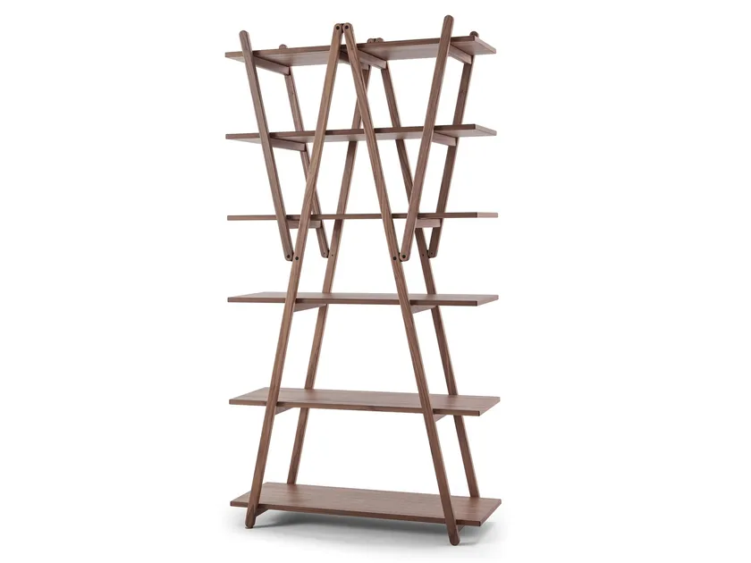 Realizzata in legno massello con pregiata finitura in Noce Canaletto, la Libreria Nuvola Rossa si distingue per la sua struttura pieghevole, una soluzione progettuale intelligente che consente di utilizzarla sia come libreria a parete sia come divisorio autoportante. Il sistema ad elementi incrociati crea un ritmo geometrico equilibrato, che alleggerisce visivamente la struttura pur garantendo soliditร e stabilitร .
