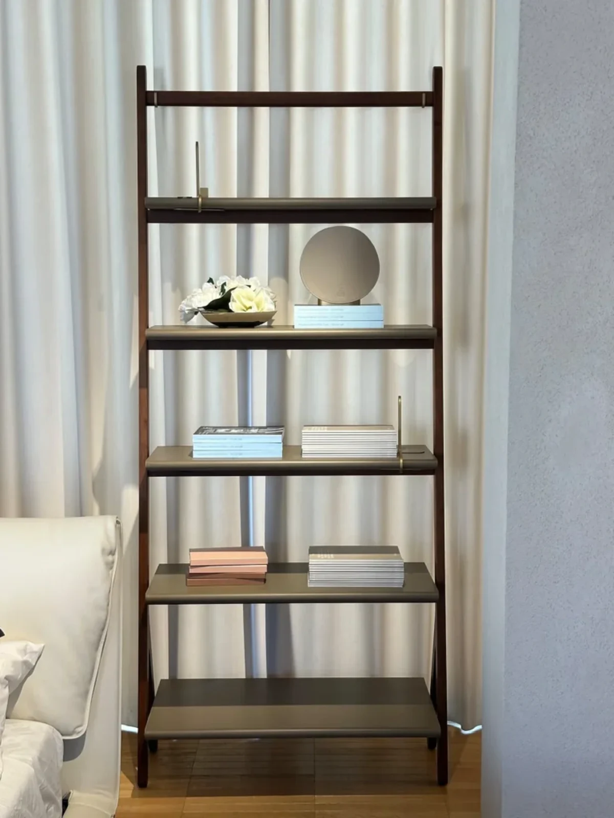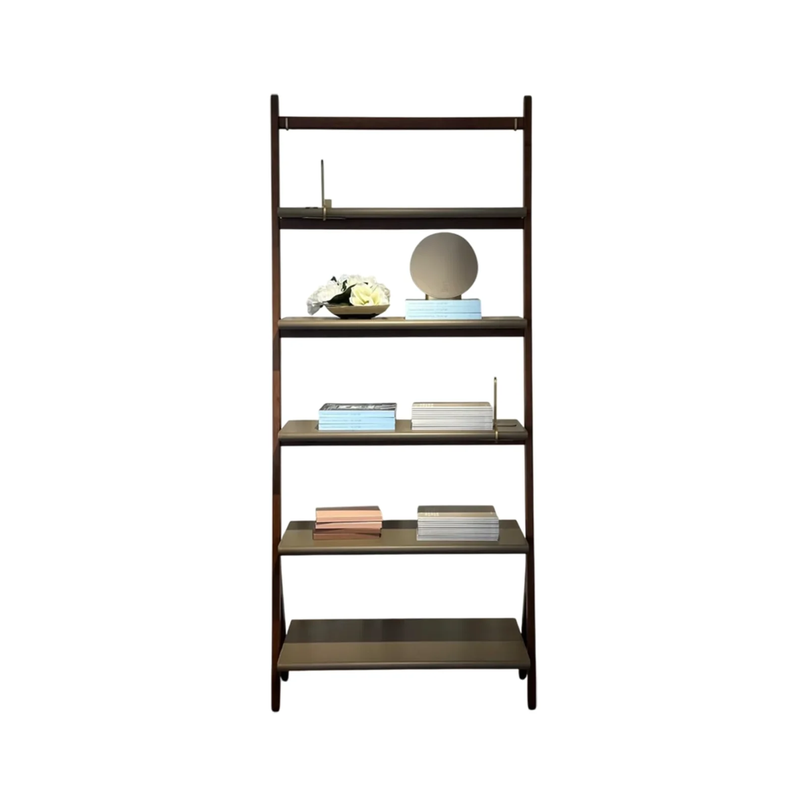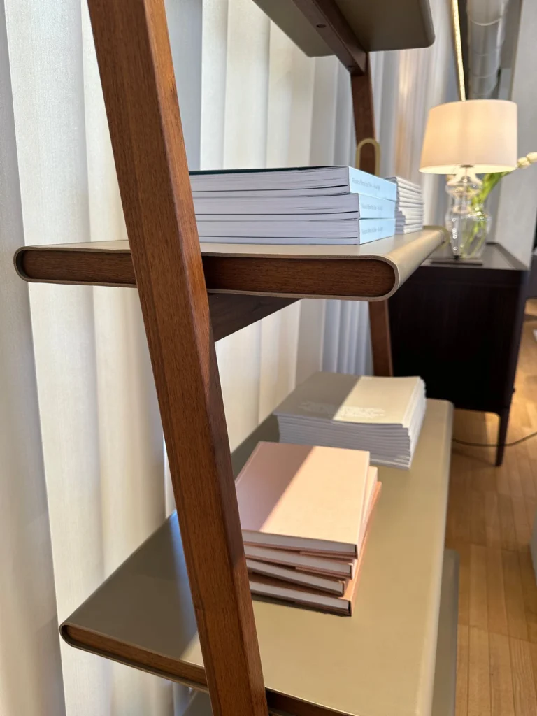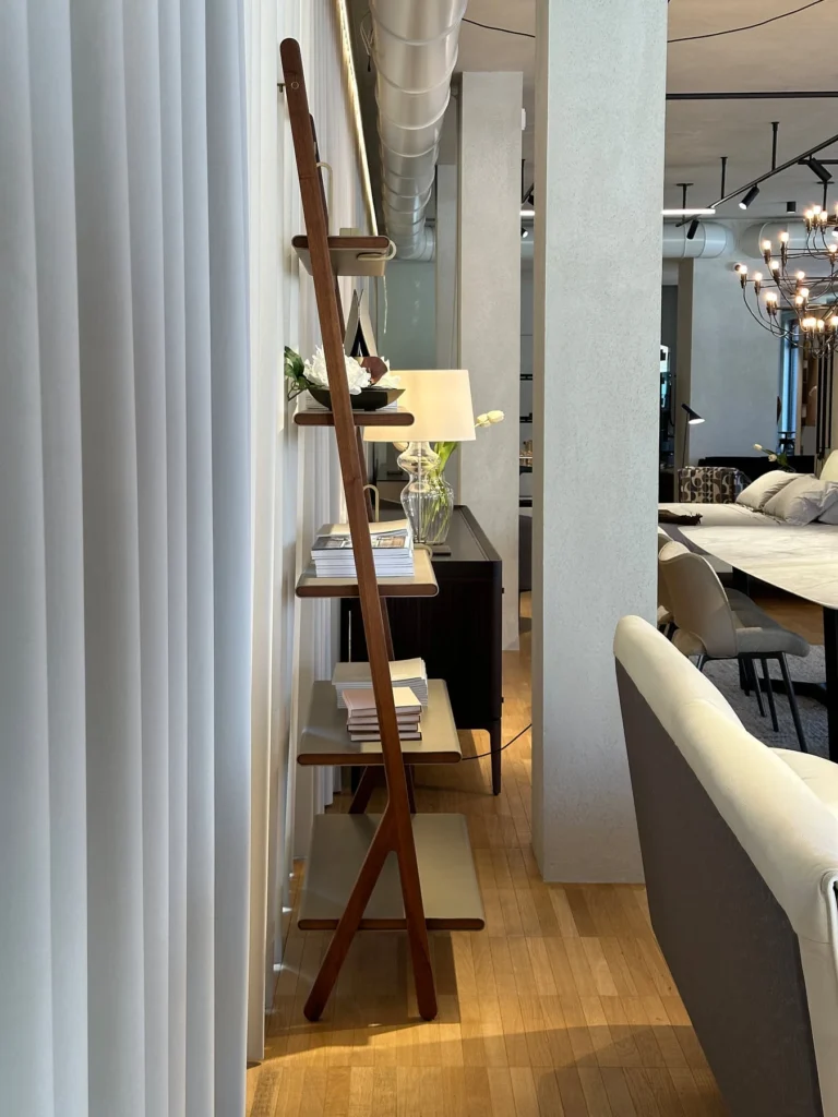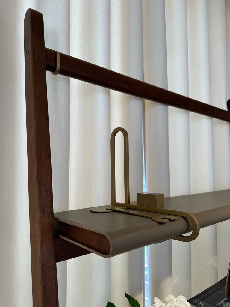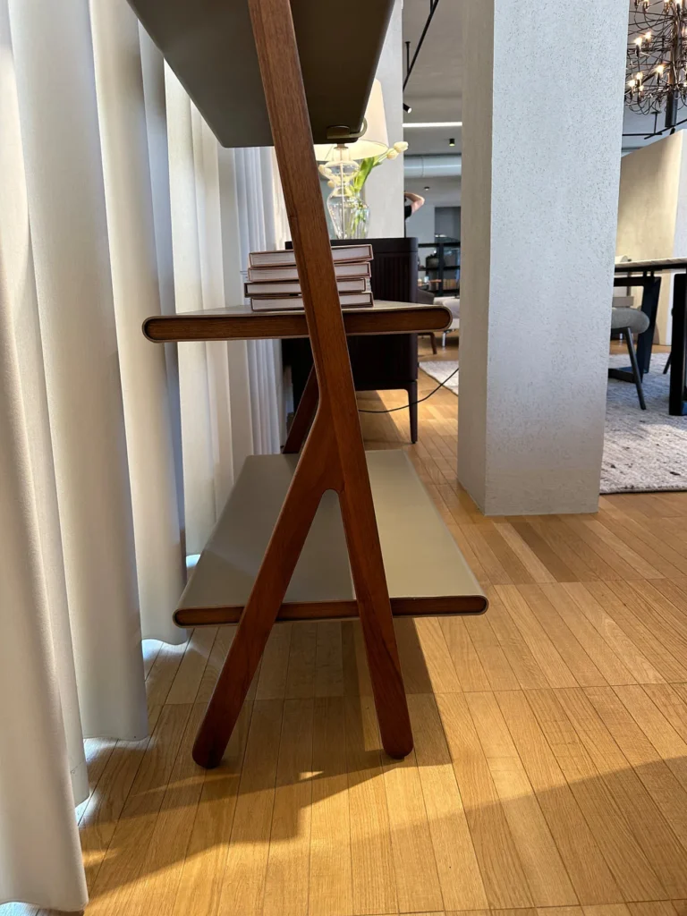 Il design si basa su un gioco di linee grafiche che richiamano la concezione orientale dello spazio, con geniali sospensioni, gioco di contrappesi e semplici incastri. Ogni elemento esprime la filosofia di equilibrio e interdipendenza del segno "ren", dove due tratti si sostengono reciprocamente, proprio come le strutture principali e secondarie della libreria. La struttura in legno massello di noce canaletto e i dettagli in ottone ne completano lโaspetto, evocando un'eleganza senza tempo.