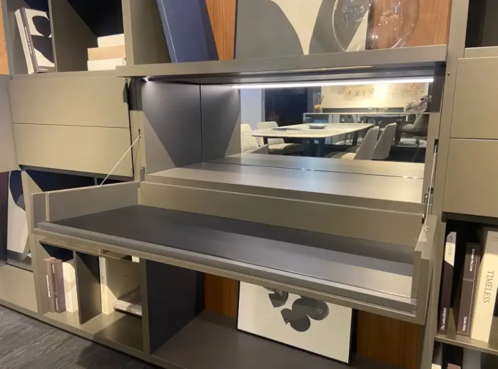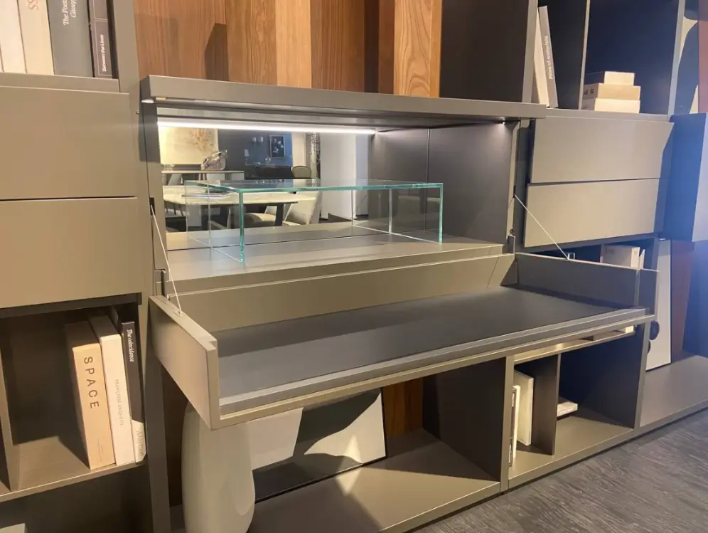 Gli elementi aggiuntivi come le ante a ribalta Jet, laccate in Lo Visone con inserti in cuoio nero e specchi, trasformano la libreria in un angolo multifunzionale, ideale per un bar casalingo o un home office. Queste ante offrono una soluzione pratica e stilosa per nascondere o esporre oggetti a seconda delle esigenze. I cassetti Slim laccati in Lo Visone forniscono ulteriore spazio di archiviazione senza compromettere l'estetica del mobile. L'illuminazione LED retromensole, con una temperatura di colore di 3100K, valorizza ogni dettaglio del tuo arredamento, creando un'atmosfera accogliente e sofisticata. Questa illuminazione non solo migliora la visibilitร , ma aggiunge anche un tocco di lusso all'intero sistema.