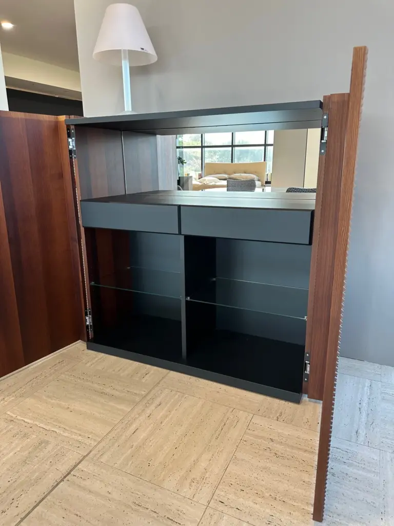 La madia si distingue per le sue ante laterali dotate di cerniere a scomparsa, che conferiscono un aspetto pulito e moderno. Il mobile รจ rifinito anche sullo schienale, permettendo un posizionamento versatile in qualsiasi ambiente, senza doverlo necessariamente appoggiare a una parete. All'interno, รจ presente un ripiano in vetro, che offre uno spazio elegante per riporre oggetti. Su richiesta del cliente, รจ possibile aggiungere due cassetti scorrevoli su binari, per un'organizzazione ancora piรน funzionale.