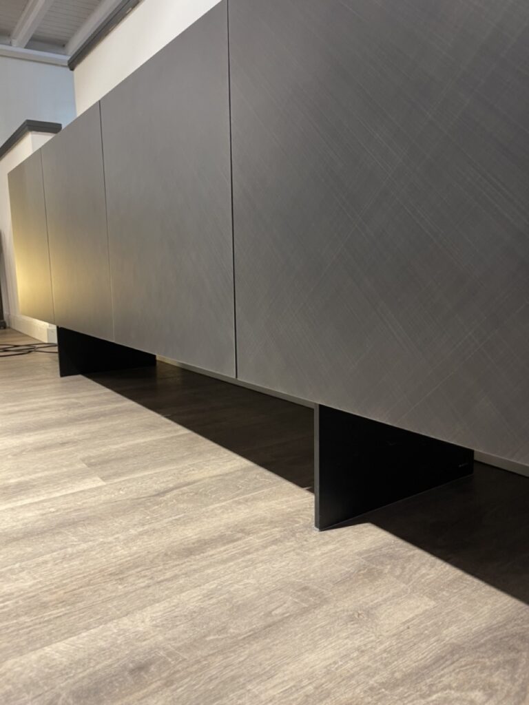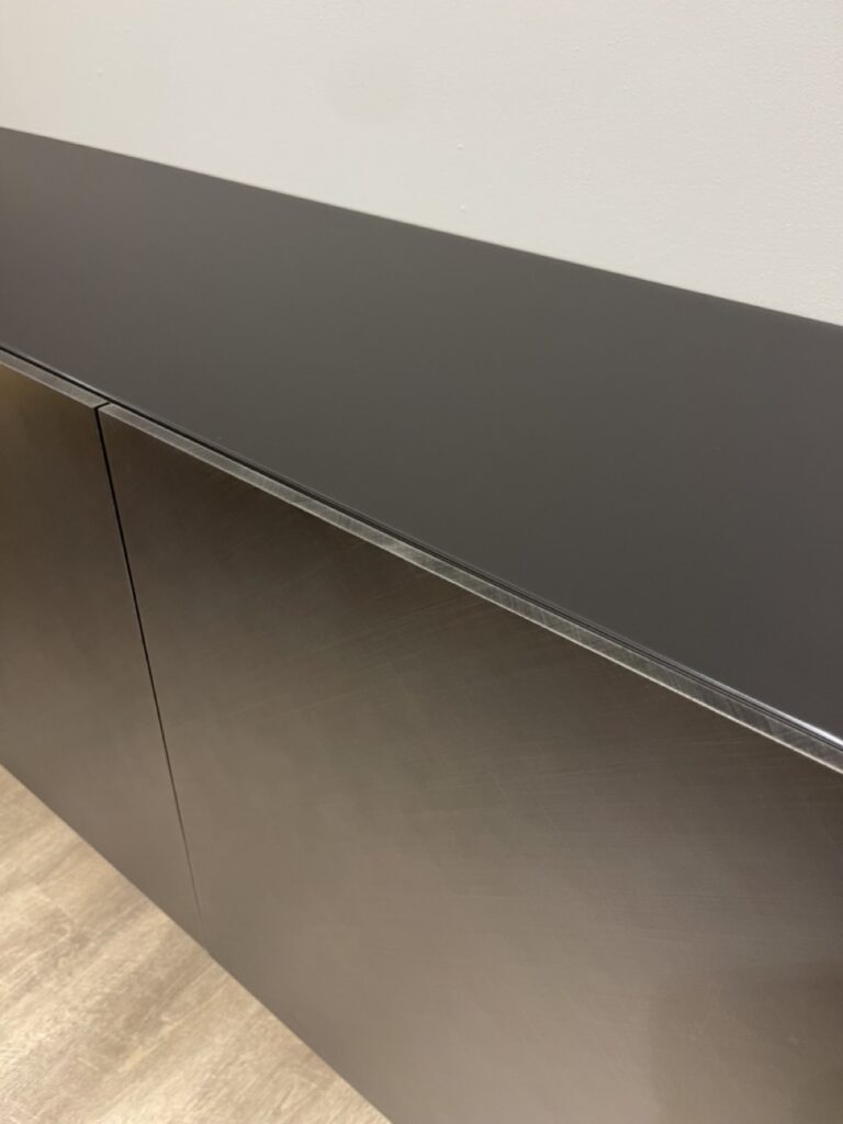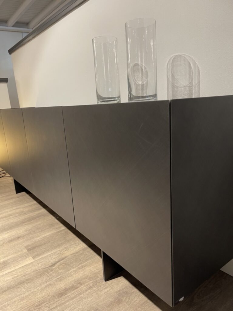 La madia di design Arizona, firmata da Alessio Bassan, รจ impreziosita da finiture spazzolate, realizzate a mano libera da sapienti artigiani. Il modello Arizona presenta la pregiata finitura Brushed, che decora le ante con delicati graffi metallizzati. Quasi sospesa nella zona living e sostenuta da moderni piedi in acciaio verniciato, questa madia moderna presenta un top in cristallo extrachiaro verniciato moka e ripiani interni in legno, perfetti per massimizzare la funzionalitร  e la capienza.