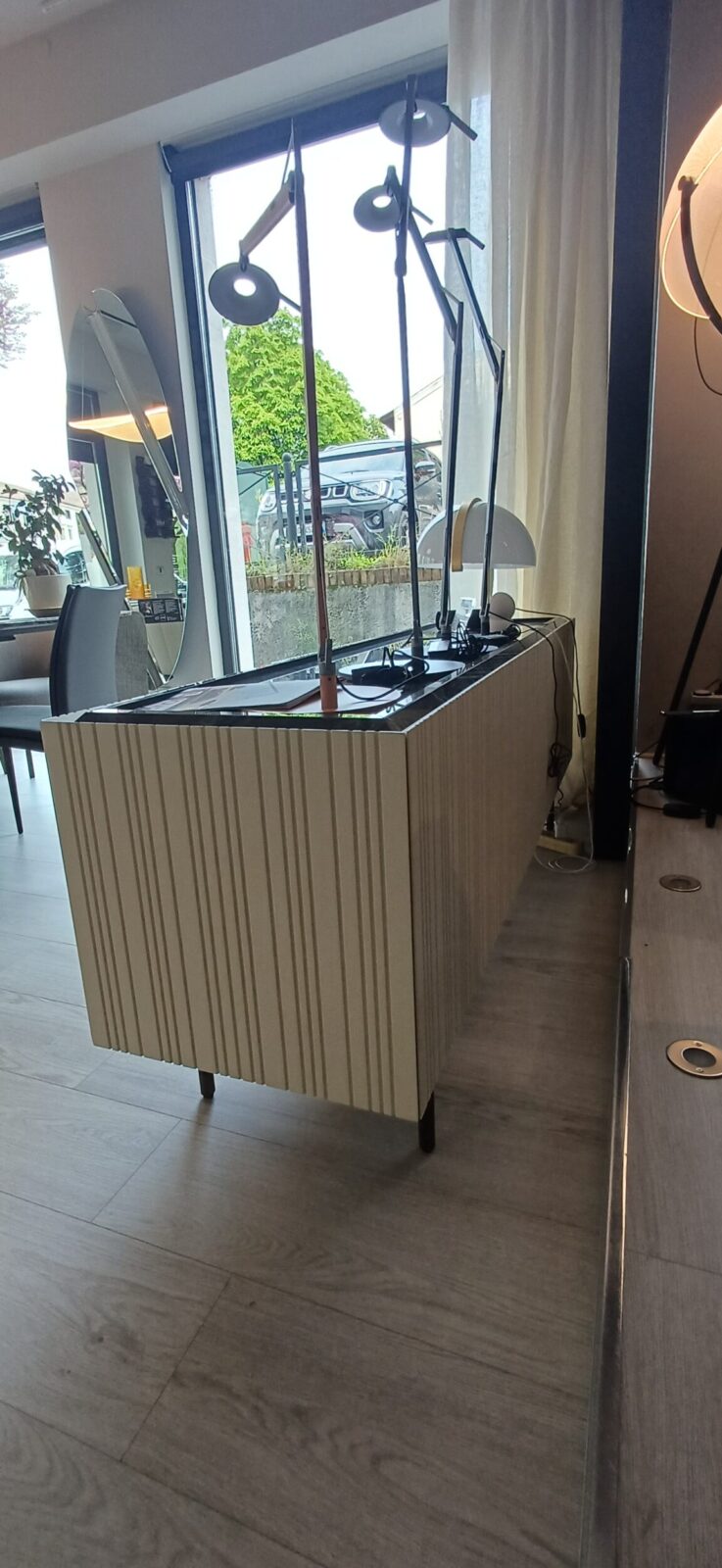 La struttura รจ realizzata in laccato opaco colore Cotone, una finitura luminosa e moderna. Le ante con effetto line e profilo a 30 gradi valorizzano il design, creando un effetto pulito e minimale. Di conseguenza, la madia si integra perfettamente in ambienti eleganti.