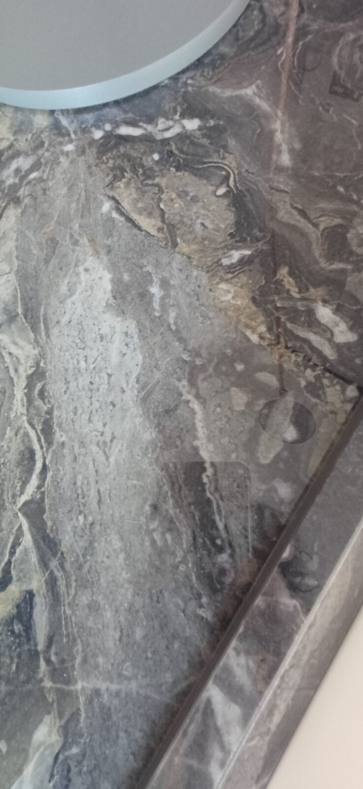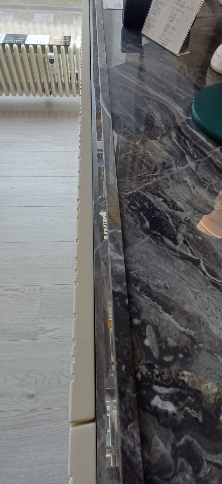 Il top in gres con spessore 2,4 cm e fascia da 3 cm con profilo spiga garantisce resistenza e unโestetica ricercata. La finitura dark lucido completa il progetto con un tocco contemporaneo e materico.