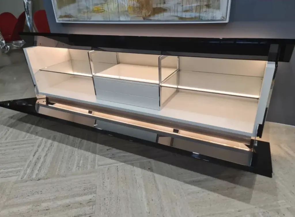 La madia Ludwig รจ dotata del rivoluzionario sistema di apertura Dual-Flapยฎ, un meccanismo innovativo che permette lโapertura simultanea sia dellโanta che di una parte del piano superiore. Questo sistema facilita l'accesso agli scomparti interni, migliorando l'ergonomia e offrendo una soluzione pratica e stilosa per la gestione degli spazi. L'interno della madia รจ caratterizzato da una cornice in metallo cromato lucido, che aggiunge un tocco di raffinatezza e sottolinea l'attenzione ai dettagli tipica delle creazioni Acerbis. La madia Ludwig include un'illuminazione interna a LED con un unico interruttore e cavo di alimentazione. Questa caratteristica non solo migliora la visibilitร all'interno del mobile, ma crea anche un effetto estetico sofisticato, esaltando i materiali e le finiture della madia.