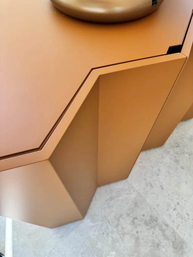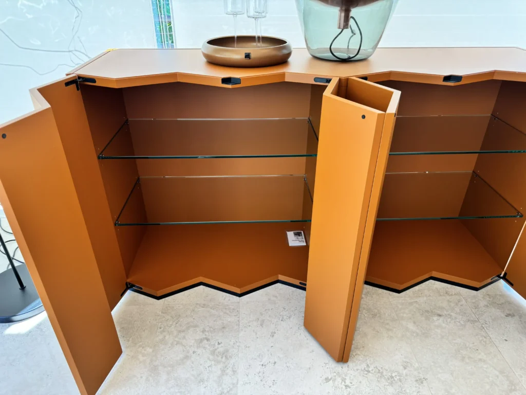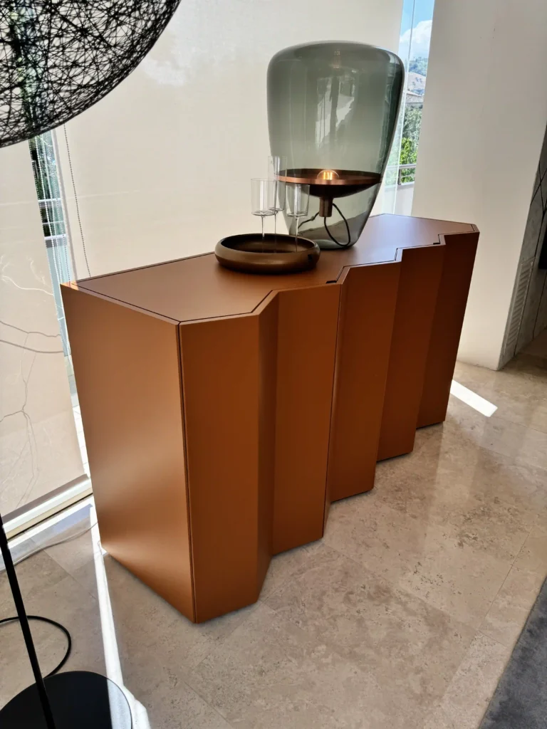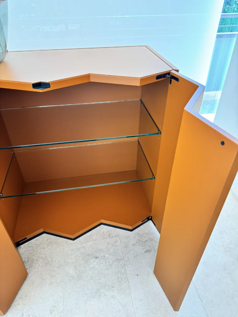 Contenitore dal design moderno, con struttura in MDF e legno listellare, disponibile in una laccatura opaca nella colorazione caramello. Gli interni sono dotati di ripiani in cristallo temperato regolabili, per una disposizione personalizzata degli oggetti. Su richiesta, รจ possibile aggiungere all'interno una fonte luminosa a LED a luce neutra, ideale per valorizzare l'interno del contenitore. Un complemento versatile, perfetto per ambienti eleganti e moderni.