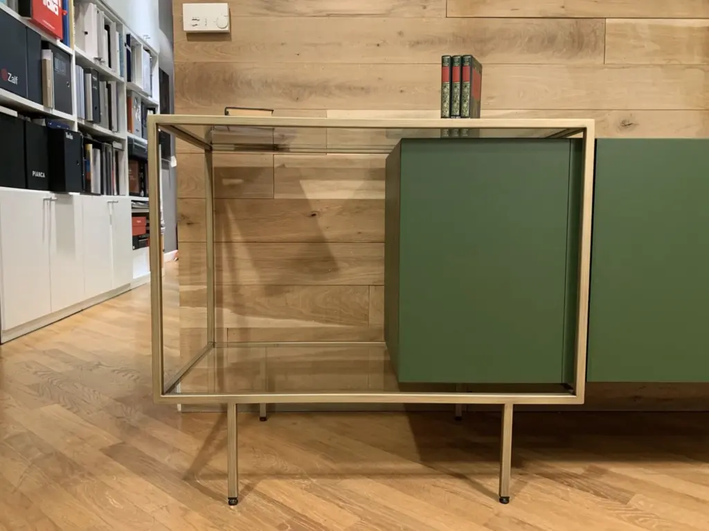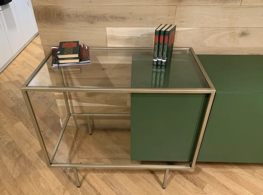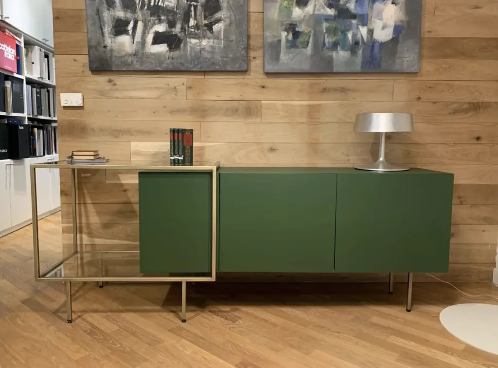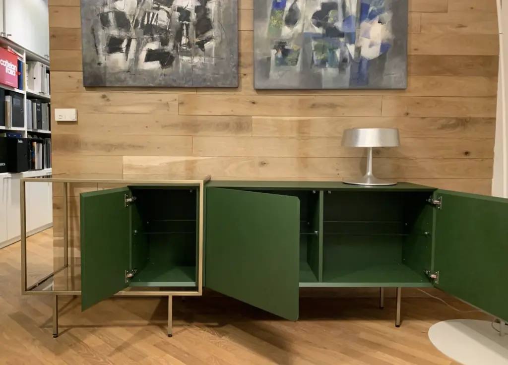 La madia Zoom di Mogg rappresenta il perfetto equilibrio tra estetica e funzionalitร . Le sue dimensioni di 212 cm di lunghezza, 50 cm di profonditร e 79 cm di altezza la rendono un pezzo imponente ma versatile, capace di arricchire qualsiasi ambiente con il suo design contemporaneo. La struttura in MDF laccata verde dona robustezza e un tocco di colore distintivo, mentre il telaio in bronzo aggiunge eleganza e stabilitร .