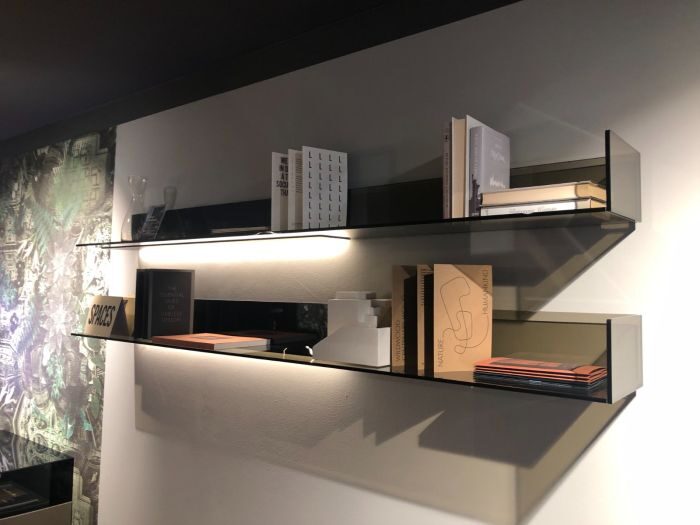 Il ripiano in vetro lucido bronzo si combina con un elemento laterale in vetro nero, creando un contrasto materico di grande impatto. Di conseguenza, la mensola diventa un vero elemento decorativo oltre che funzionale, capace di arricchire qualsiasi parete.