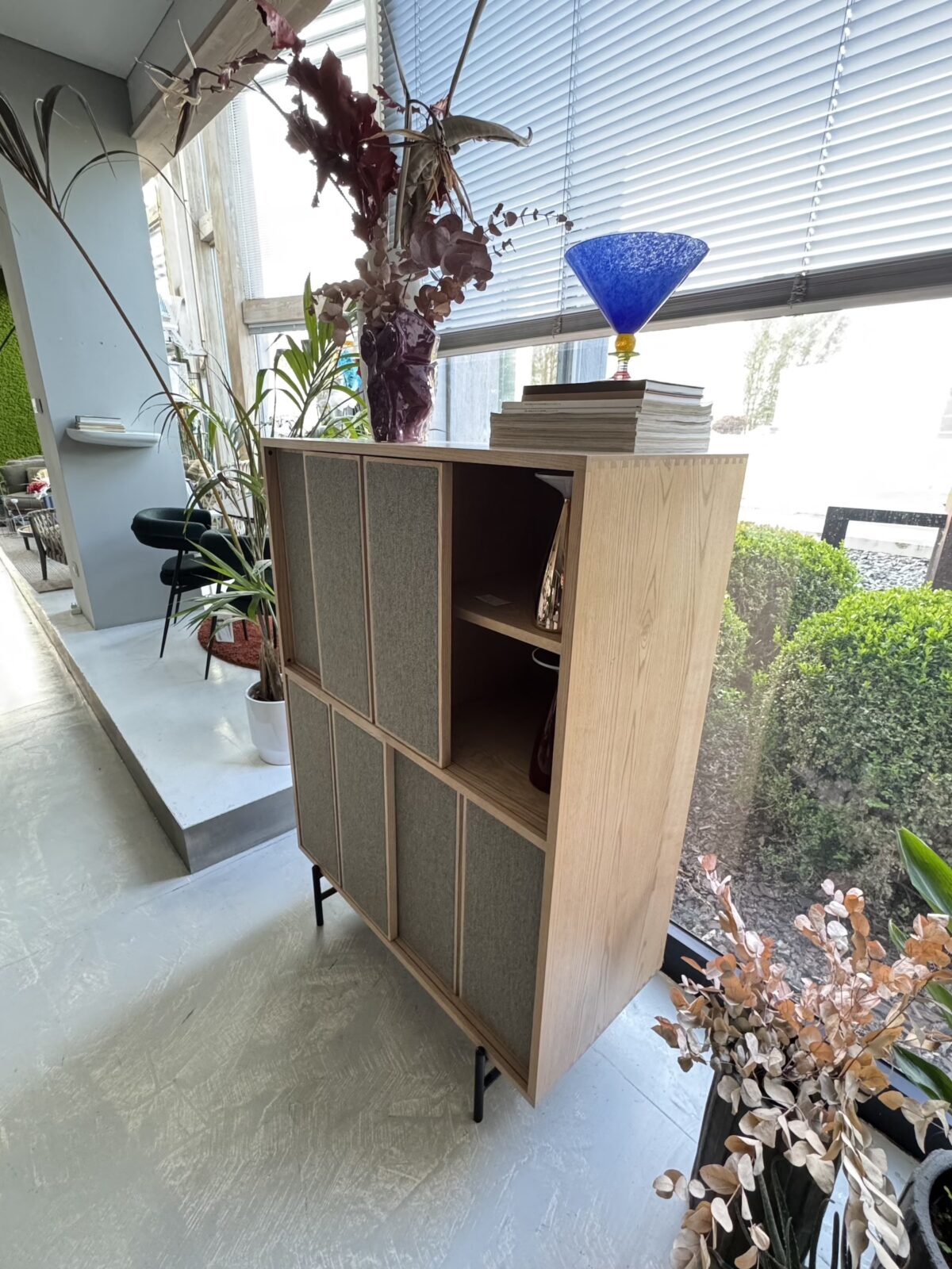 Le ante scorrevoli rivestite in tessuto rappresentano lโelemento distintivo del progetto. Non solo donano un aspetto caldo e materico, ma garantiscono anche un utilizzo fluido e silenzioso. Di conseguenza, il mobile risulta elegante e funzionale.