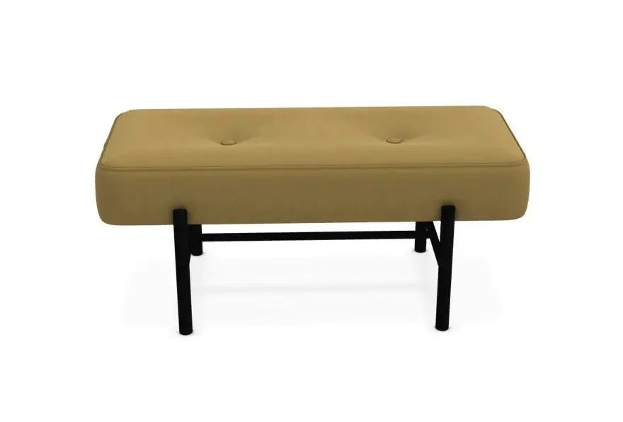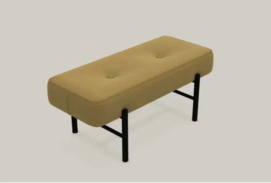 Il sedile imbottito, impreziosito da due bottoni rivestiti nello stesso materiale, aggiunge un dettaglio sartoriale che valorizza lโestetica pulita della panca. La struttura portante in metallo verniciato nero crea un contrasto elegante con il rivestimento, enfatizzando il carattere contemporaneo del progetto.