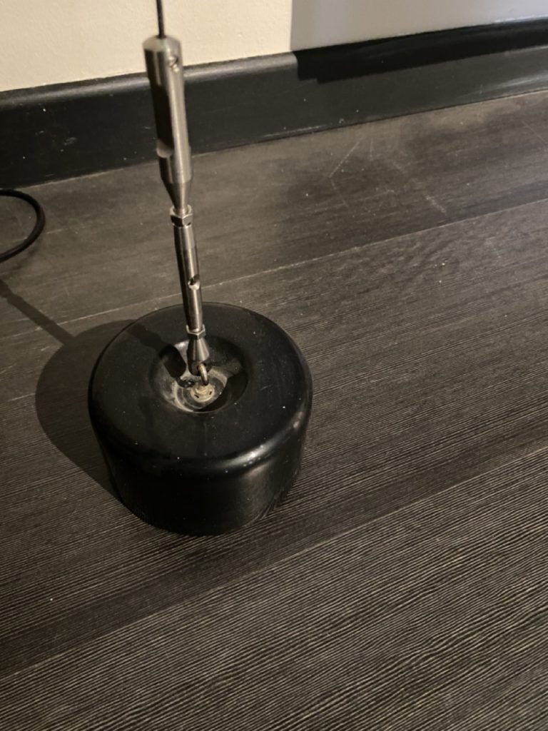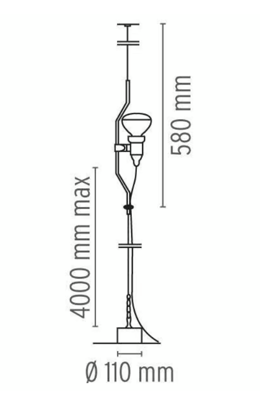 • Struttura: La lampada รจ composta da un tubo di acciaio sagomato, che funge da braccio principale. Questo braccio รจ fissato al soffitto tramite un cavo di acciaio, che consente di spostare il diffusore in vetro in verticale per regolarne l'altezza. Questa funzionalitร  rende la lampada estremamente versatile, adattabile a diverse altezze e spazi.