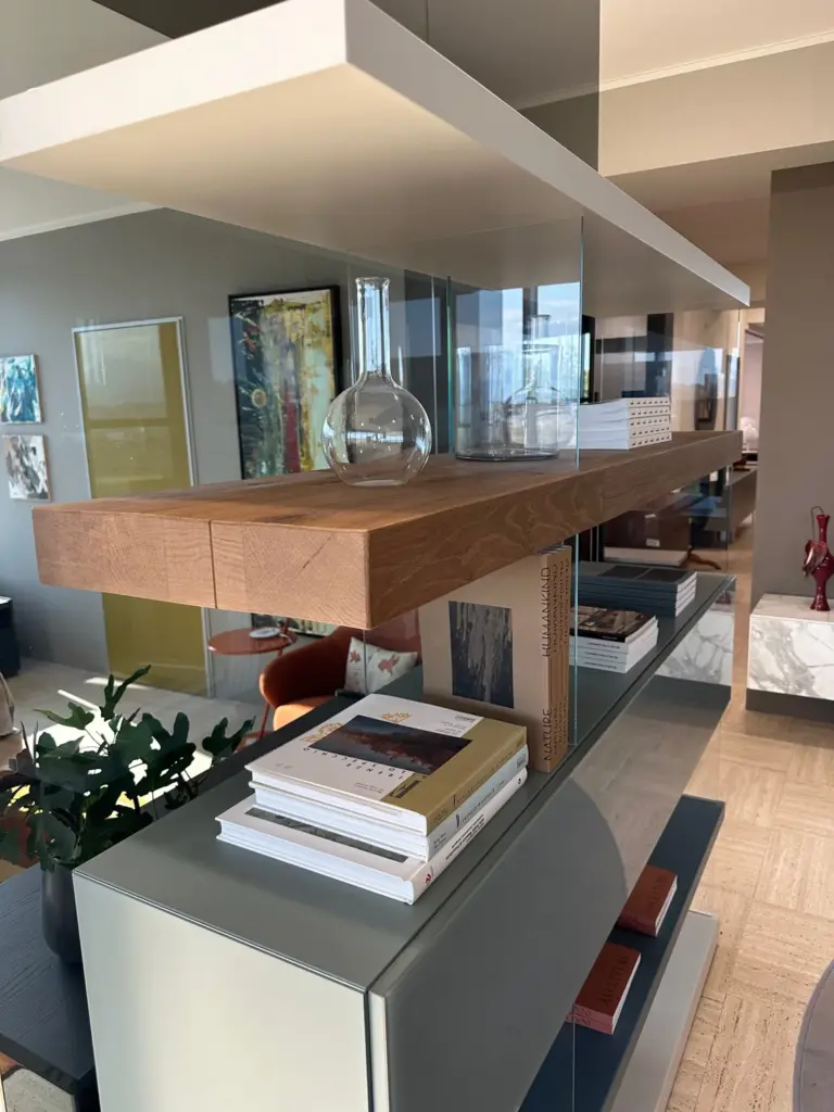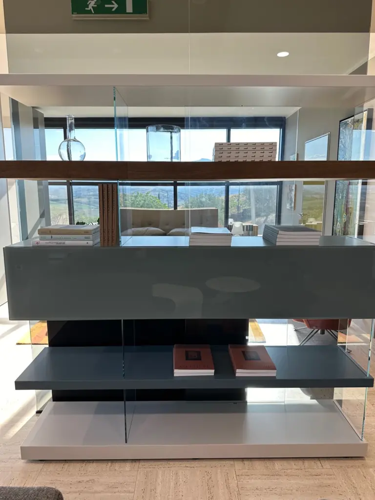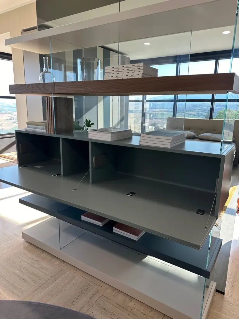 Realizzata in legno laccato o rovere Wildwood e vetro temperato resistente, la parete attrezzata Air รจ in grado di sopportare urti e stress quotidiani, garantendo una lunga durata nel tempo.ย Il design gioca con trasparenze e colori, combinando ripiani in legno con supporti in vetro trasparente. Questa scelta di materiali crea un effetto visivo di leggerezza e sospensione, dando lโimpressione che la parete galleggi nello spazio.ย Disponibile in diverse configurazioni, Air puรฒ essere personalizzata per adattarsi perfettamente a qualsiasi spazio. Gli elementi componibili come i vani aperti e chiusi, i divisori interni e i ripiani regolabili offrono infinite possibilitร di personalizzazione.ย Il modello 1242 presenta frontali in XGlass Calacatta oro opaco, laccato nei colori bianco, juta, avana e nero, con set di vetri trasparenti, offrendo una combinazione elegante e contemporanea. Air Shelf non richiede fissaggi a parete, rendendolo completamente indipendente. Puรฒ essere posizionato al centro della stanza come divisorio o contro una parete, a seconda delle necessitร del cliente.