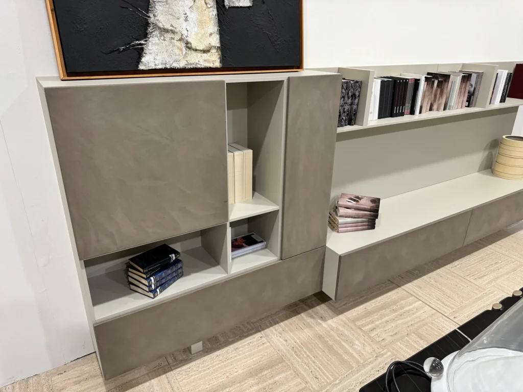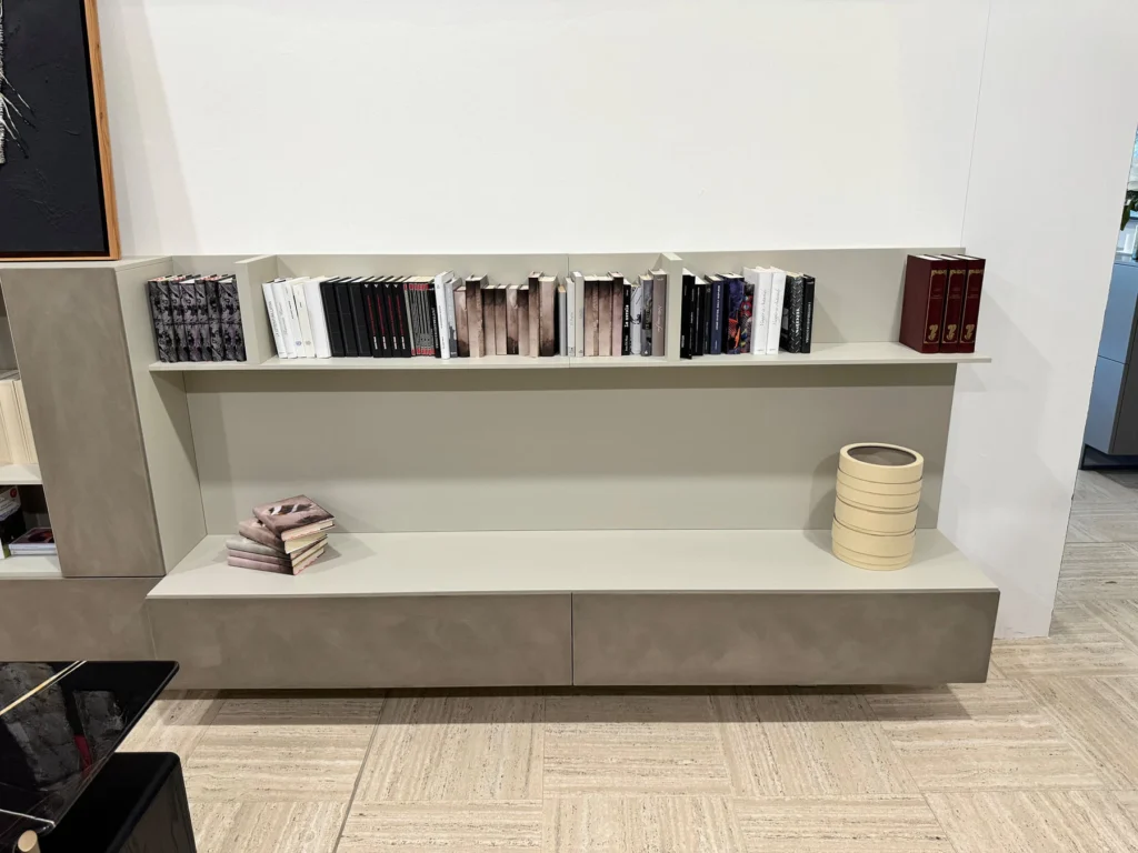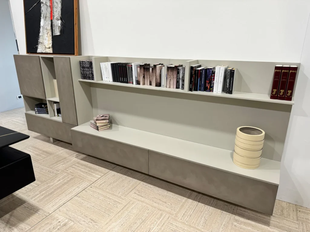 La parete attrezzata T030 รจ un sistema modulare che offre una gamma versatile di contenitori e mensole, pensata per integrarsi in diversi ambienti domestici, sia appoggiata a terra che sospesa. La configurazione comprende un contenitore base multimediale: 180 x 48 cm, con anta a ribalta e pannello boiserie per il cablaggio di TV e altri dispositivi multimediali. Un contenitore a ribalta: 60 x 36 cm, ideale per contenere oggetti di uso quotidiano con accesso facilitato. Un pannello boiserie: 180 x 120 cm, con interno cavo per facilitare il cablaggio dei dispositivi elettronici, garantendo ordine e discrezione. Una mensola con divisori: 180 x 30 cm, perfetta per organizzare libri e accessori in modo ordinato e funzionale. La parete attrezzata T030 รจ rifinita in color sabbia e grafite, due tonalitร neutre che aggiungono un tocco di modernitร a qualsiasi ambiente.