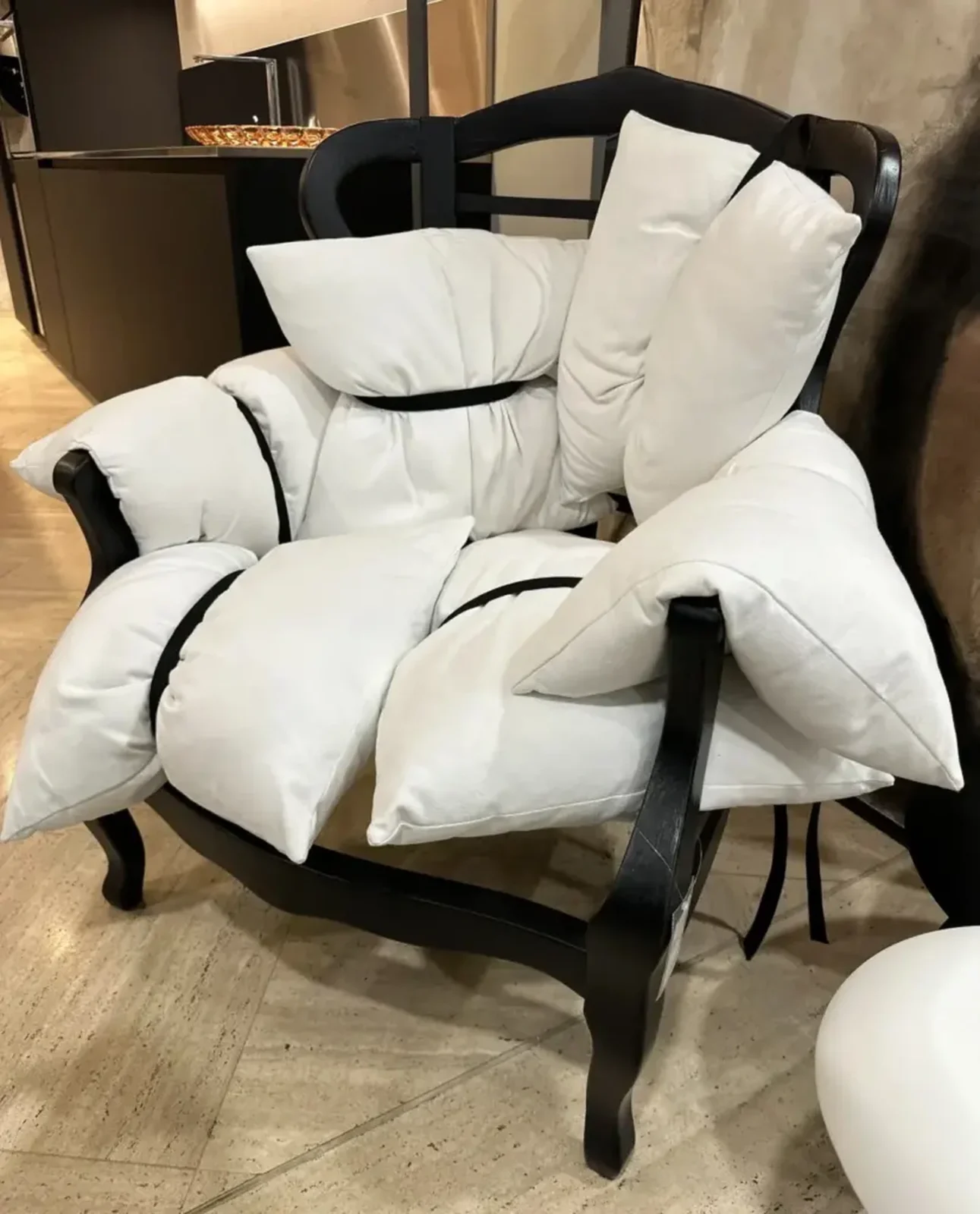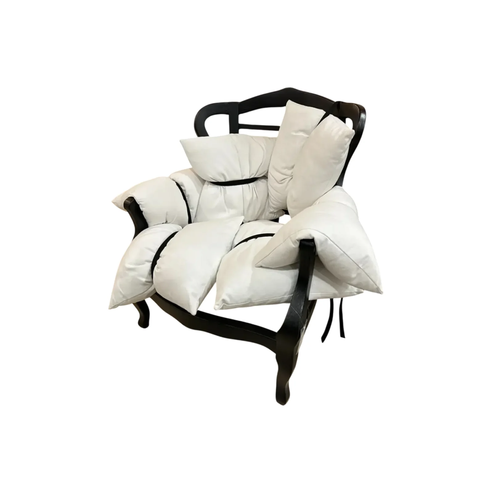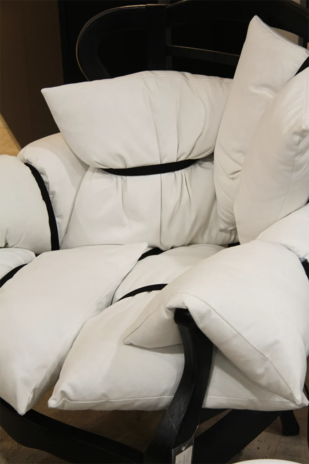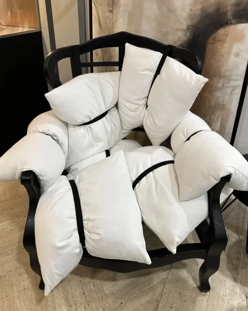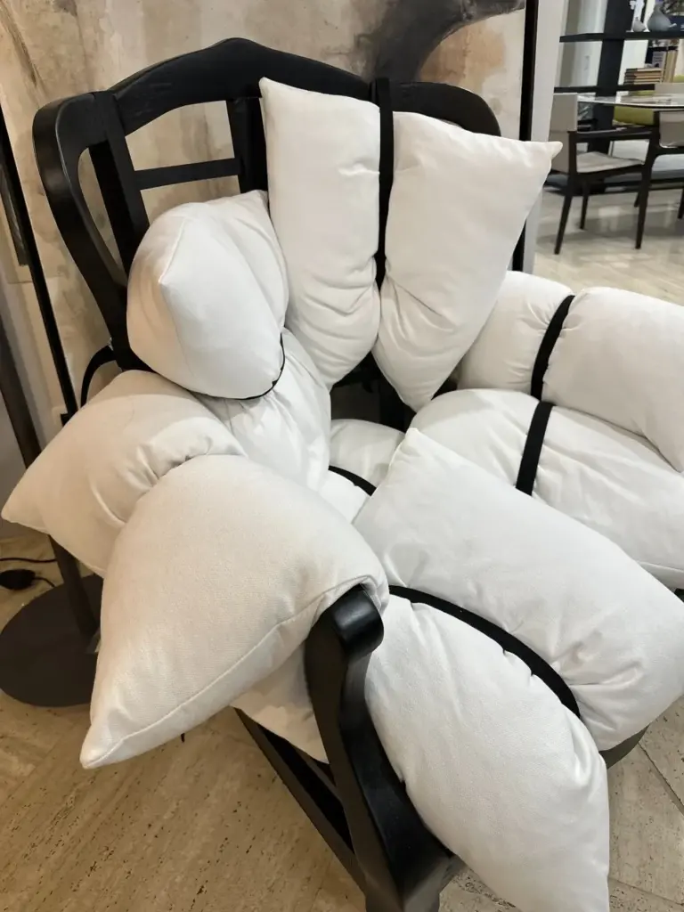 La particolaritร  di 7 Pillows risiede nella sua composizione: i sette cuscini, fissati alla struttura con cinghie nere, sembrano essere disposti in modo casuale, conferendo alla poltrona un look disinvolto ma estremamente sofisticato. Un mix di design innovativo e comfort senza pari, questa poltrona รจ perfetta per aggiungere un tocco di originalitร  a qualsiasi ambiente.