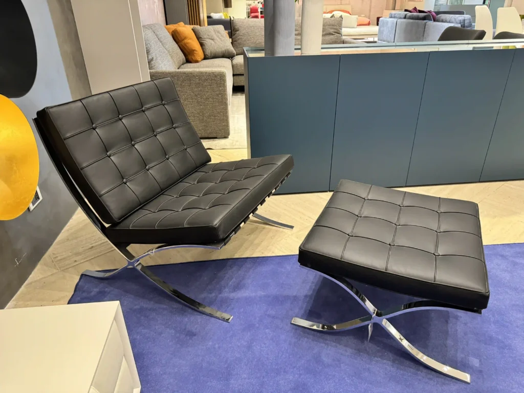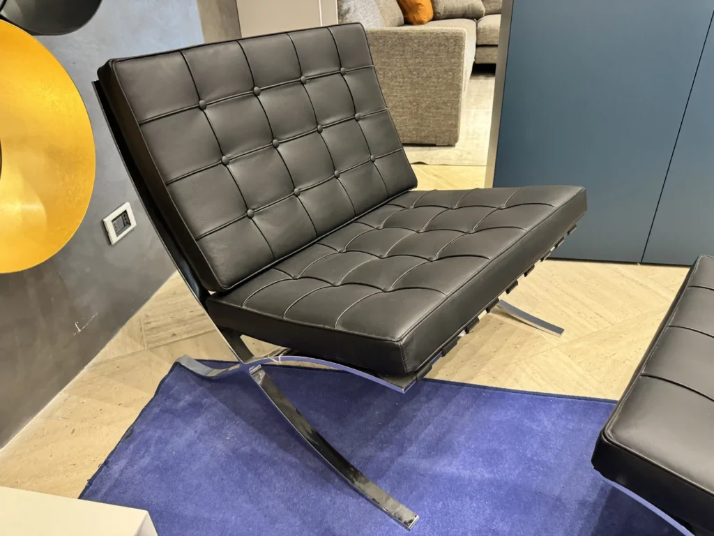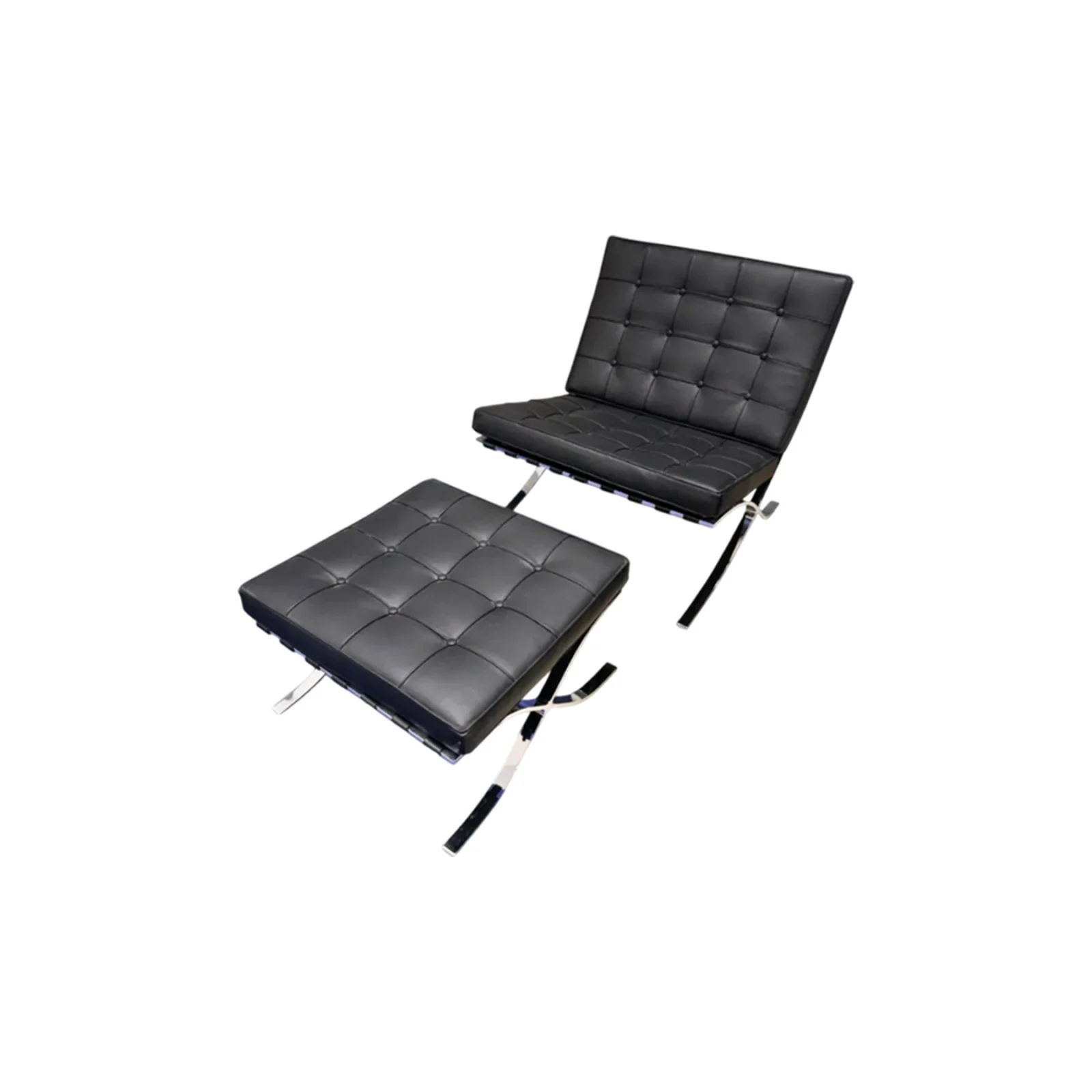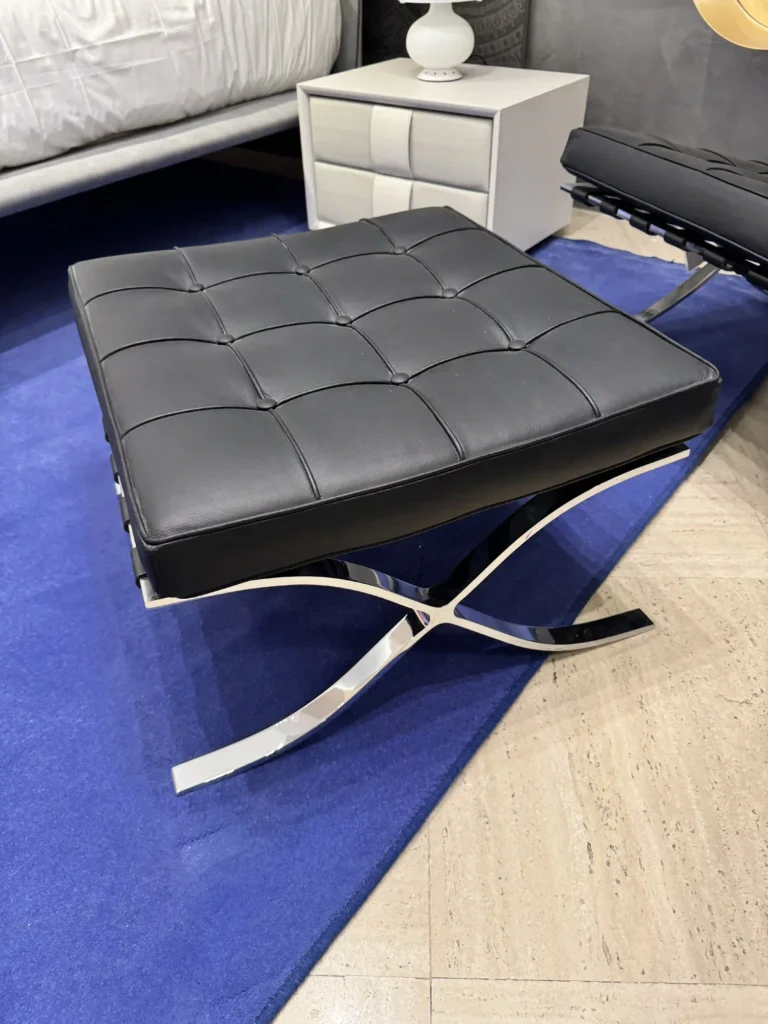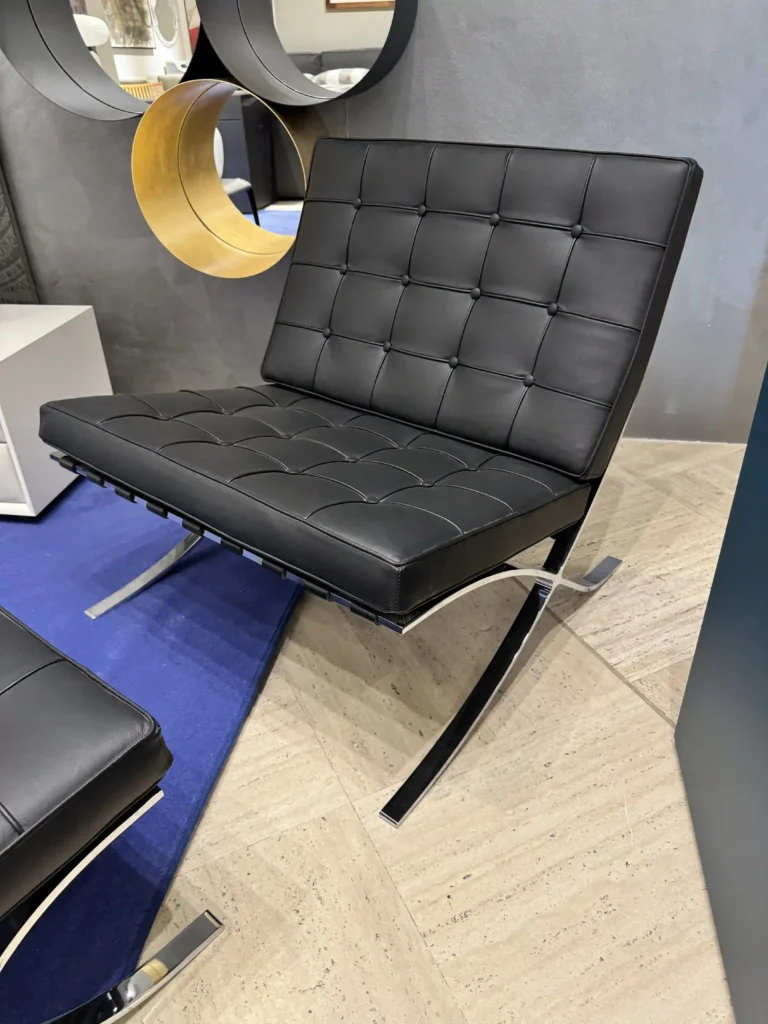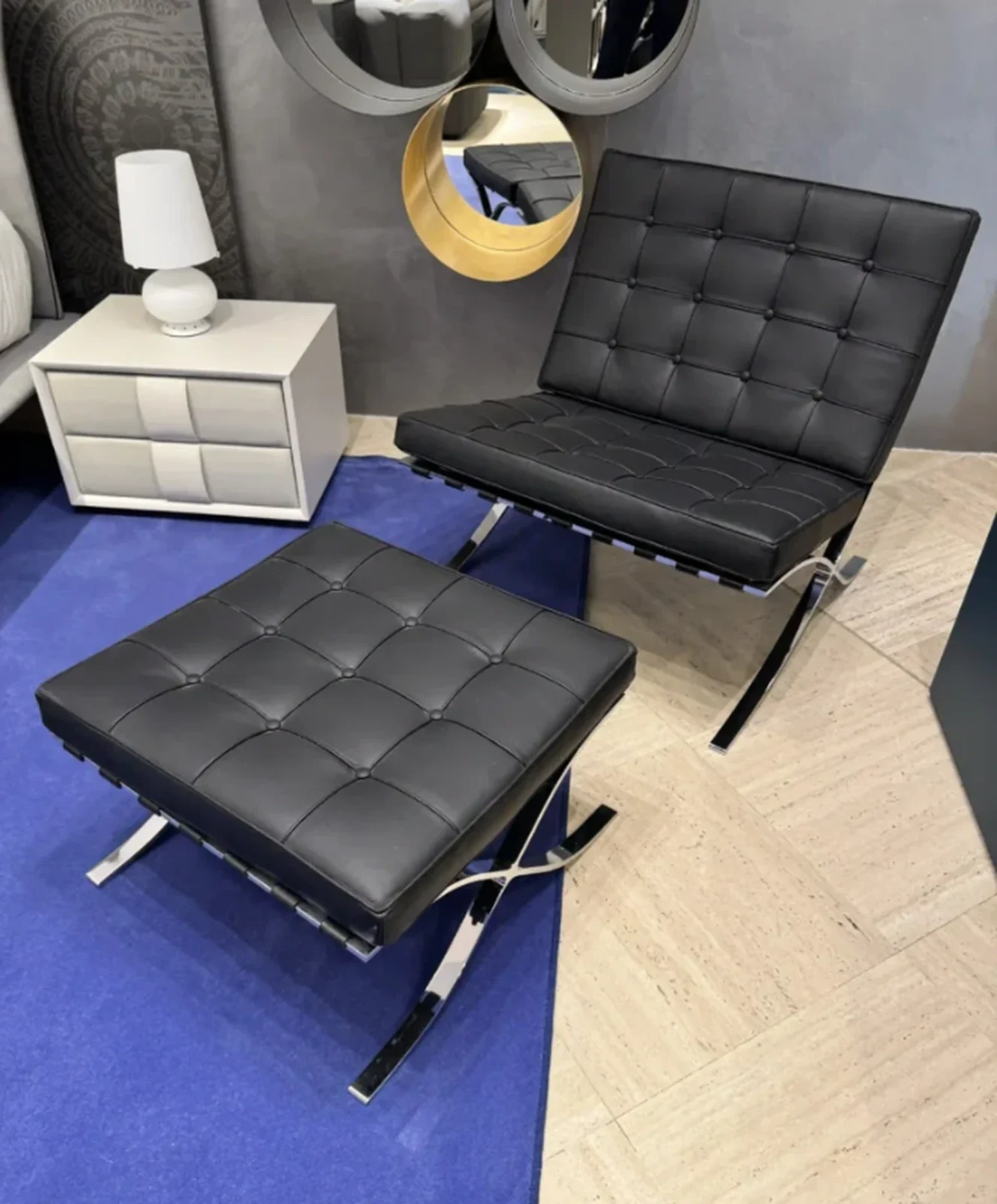 Barcelona, progettata da Mies Van Der Rohe, รจ unโicona del design moderno che unisce eleganza e comfort. La struttura รจ in acciaio inossidabile con finitura a specchio, esaltando lโestetica minimalista e senza tempo. Le cinghie elastiche sono rivestite in pelle di alta qualitร , mentre i cuscini, imbottiti in schiuma poliuretanica, presentano un rivestimento in pelle nera, tagliato e cucito a mano per un tocco artigianale. Barcelona รจ un complemento d'arredo che porta nella tua casa il fascino senza tempo del design classico. Contattaci per ulteriori dettagli!