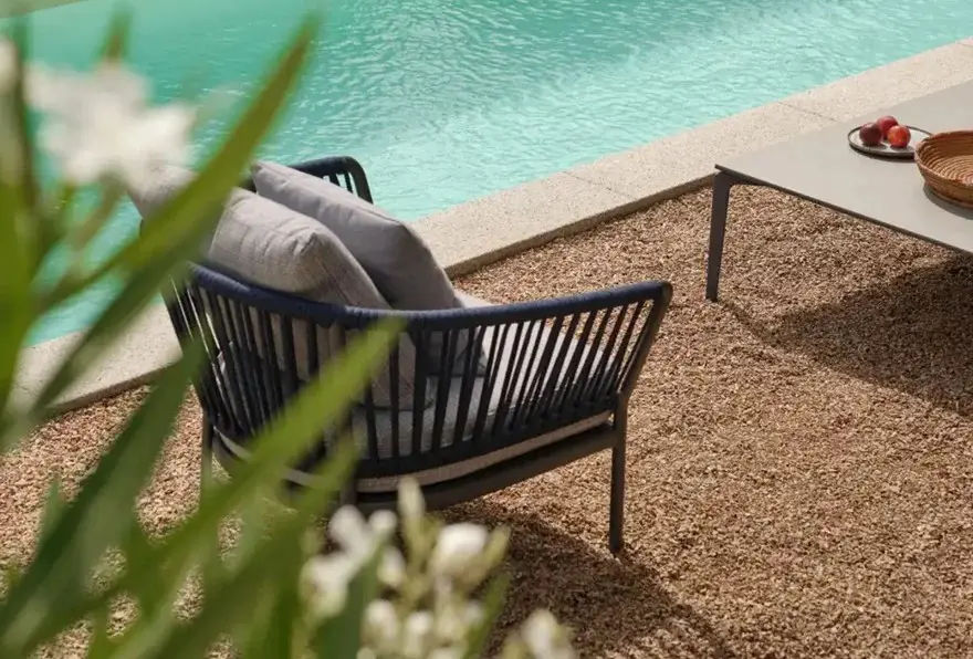 La seduta รจ completata da un cuscino in tessuto Range 3 Navarone Seta, studiato per offrire comfort e qualitร anche in ambienti esterni. Una poltrona ideale per giardini, terrazze e verande dal gusto contemporaneo.