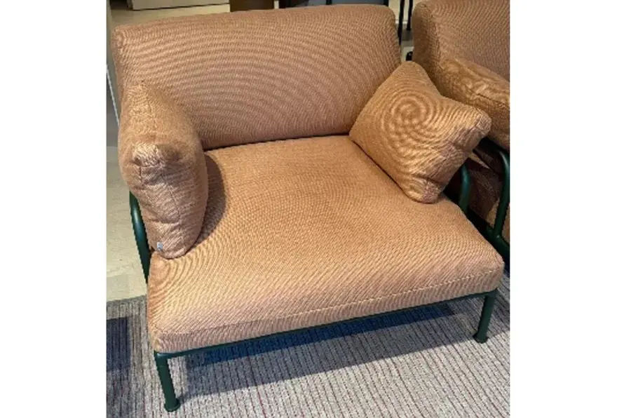 Elemento distintivo della collezione è il giunto pressofuso, che raccorda con precisione i profili estrusi in alluminio, garantendo solidità strutturale e pulizia formale. La versione con braccioli è proposta con struttura in alluminio verniciato Verde Bottiglia, abbinata a un rivestimento in semipelle Cashmere e tessuto Range 3 Mojito Caramello, per un equilibrio armonioso tra comfort e resistenza.