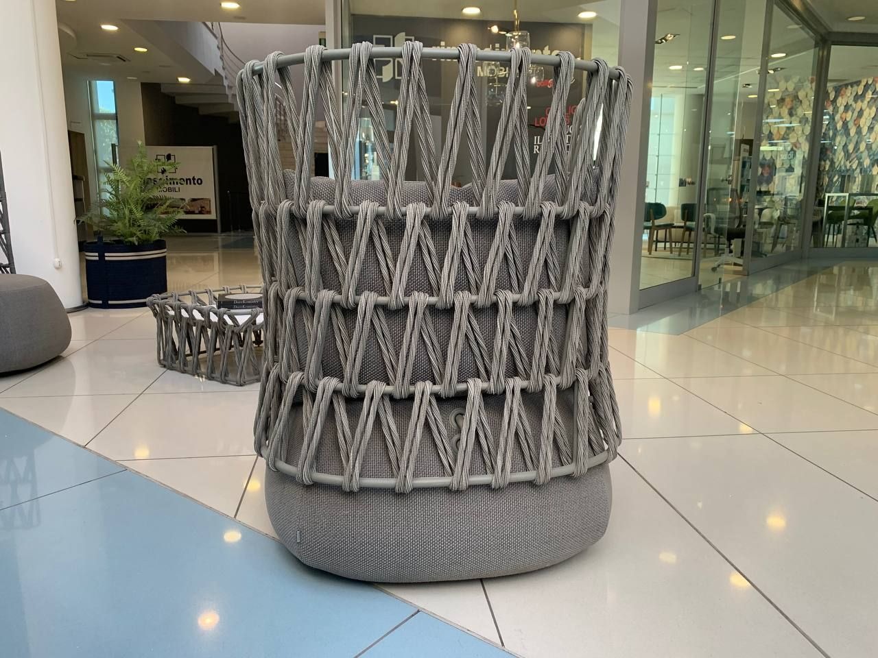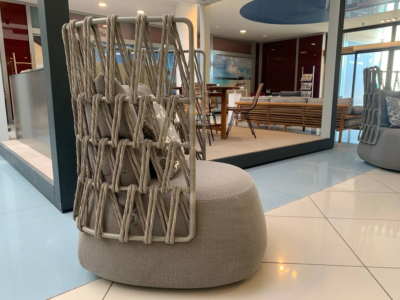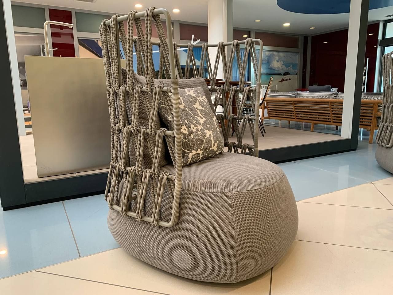 La Fat-Sofa Outdoor di B&B Italia combina comfort e design. La struttura in alluminio verniciato grigio รจ leggera ma resistente. Inoltre, lโintreccio in fibra di polietilene tortora offre un effetto elegante e naturale.