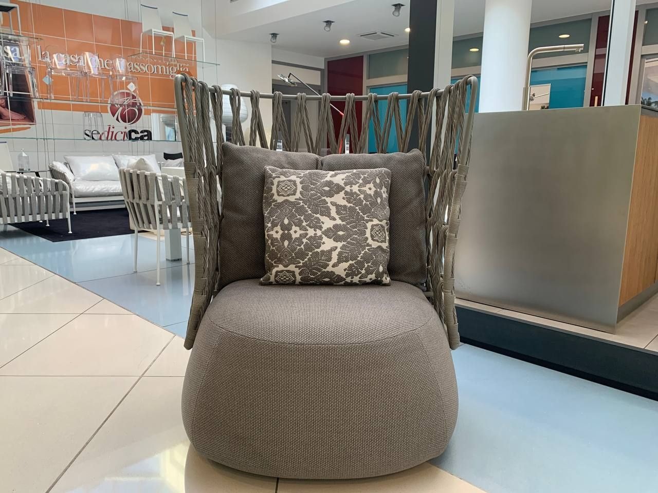 La seduta รจ rivestita in tessuto Lusso Lesia color grigio, cosรฌ risulta morbida e perfetta per lโesterno. Allo stesso tempo, nel prezzo รจ incluso un cuscino 48x48 cm in tessuto Lusso Lipari con fantasia floreale, che aggiunge un dettaglio decorativo.