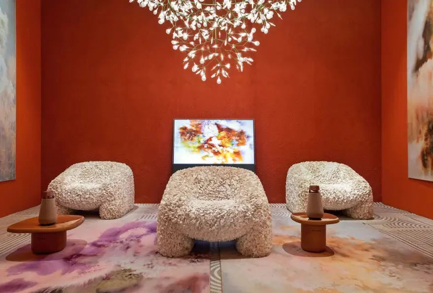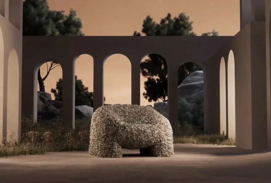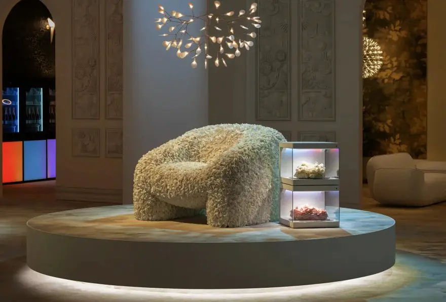 Struttura: Seduta avvolgente composta da petali tessili che creano un effetto tridimensionale.